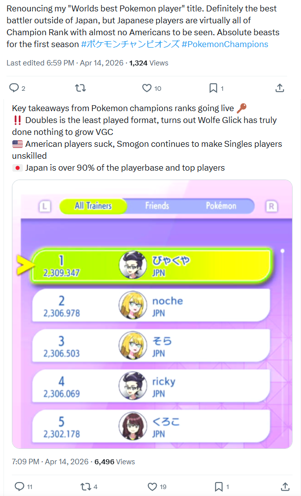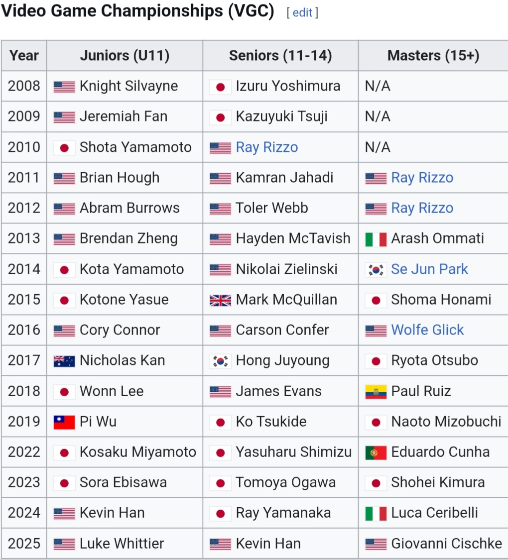>>59177034Competitive pokemon is a western game, anon. USA alone has brought home 20 VGC wins to Japan's 16. For all western countries it's 27 wins to Japan + Korea's 18 (that's across all divisions; for only masters division, it's 8 to 6).And that's just counting world championship wins, not looking at overall tournament results (because Japan has its own kid's table tournament structure that isolates it from the rest of the world, presumably for fear of national embarassment). If I asked you to name prominent or noteworthy VGC players, I bet there'd be exactly zero Japanese names you could come up with without looking it up.>Wolfe Glick>Ray Rizzo>Luca Ceribelli>Giovanni Cishke>Aaron Zheng>Marco Silva>James BaekThe only eastern name that springs to mind is Se Jun Park because of Pachirisu shenanigans but even he's Korean, not Japanese.