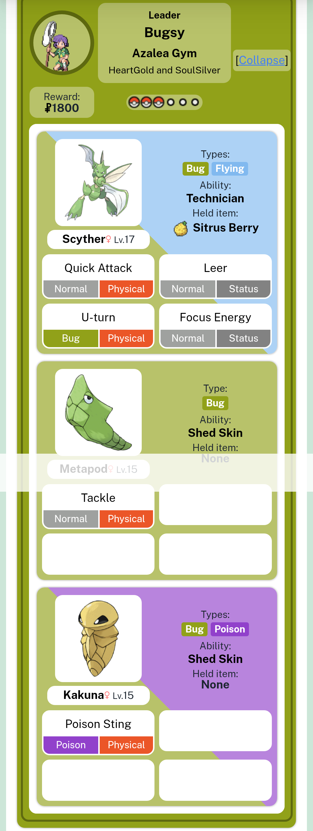 >durable cocoons slowly whittle down player’s pokemon before based defense lowering, crit raising Scyther swoops in with 70 BP STAB move to finish the job.