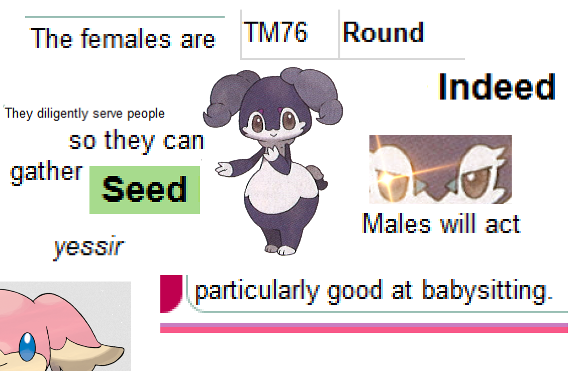 Research from the Professor Aspen has arrived. Many intense hours of study have lead my colleagues and I to the conclusion that the shape of Indeedee is purely designed for courtship. We spent hours examining every part of Indeedee to see if there was a mysterious organ with psychic power. Instead we found out that the thick soft chubby squeezable bottom of the Indeedee is just to attract males. After hours of hugs, cuddling, and groping the female Indeedee exhibits extreme fondness and happiness was seen to increase 300%. We have unanimously agreed to take an Indeedee home for future research on the matter. More results will come in the following month.
