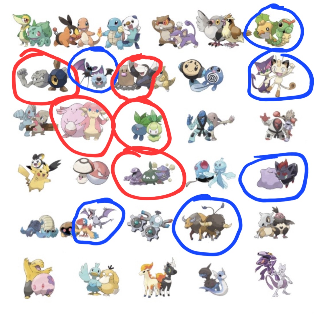 >>59187179Red = I like the Unova pokemon moreBlue = I like the Unova pokemon around equally to the kanto counterpartUncircled = I like the Kanto pokemon more