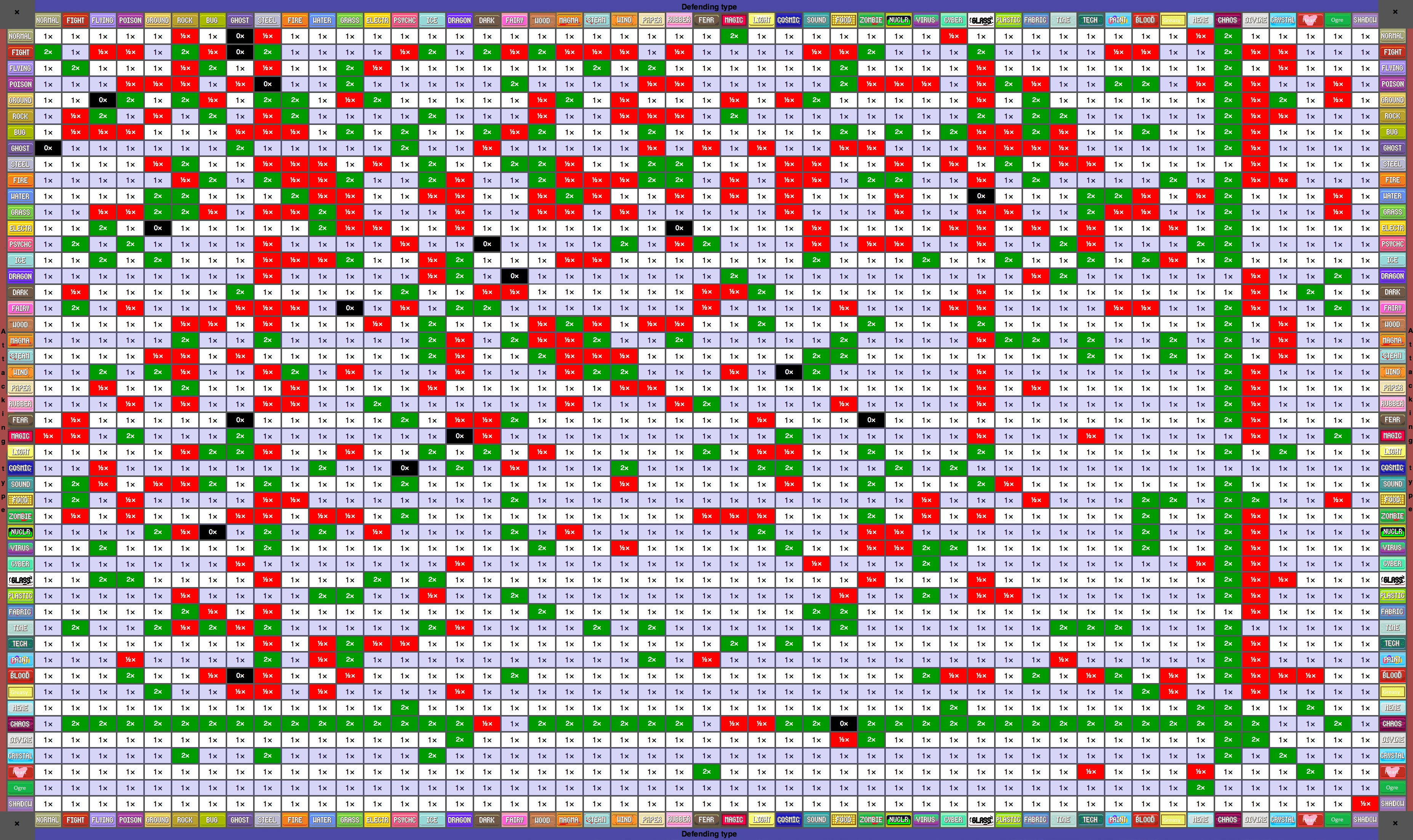 >>59181961>Weird Type Fun is incomprehensible if you play casually. The games say stuff like "clip birds wings with thunderbolt" and "Grass types hate fire" but WTF doesn't explain shit. I think you're maybe meant to write down weaknesses on a notepad or have the type chart on another tab instead of just intuiting what a Cosmic/Technology Vileplume is weak toYeahhhh I can see that being really annoying. Learning new moves and fakemon types is one thing, but a whole new type chart is a lot to take in. One of the reasons I haven't tried that Too Many Types romhack by Alpharad's crew.