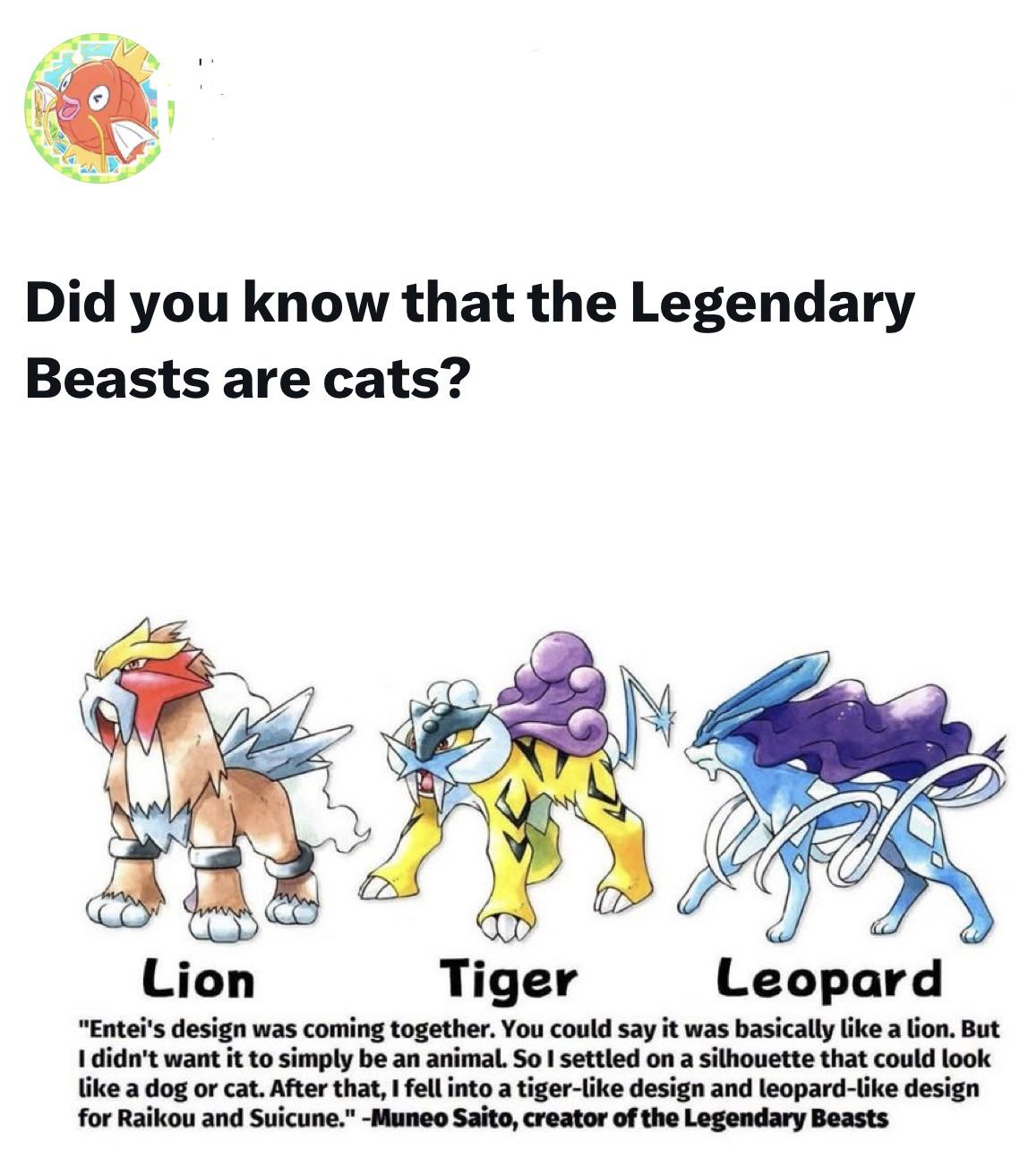 if this isn't bait, here's the skinny:>they were originally designed to be ambiguous beasts, able to be seen as dogs, cats, or else.>Entei is explicitly both a lion and a big dog like a mastiff.>Raikou is based on a Raiju, which can be interpreted as either a dog, cat, or other. It also takes inspiration from saber-toothed cats, jaguars, leopards, cheetah, etc.>Suicune is a qilin/kirin, which is most accurately a bad interpretation of a giraffe, and it was mixed with various dog and cat features like the others.>there was no official word of their origin for decades because gf>arguments for those many years. I was team cat: Lion, sabertooth, cheetah. Those were my thoughts.>people wind up joking about it, there's a common meme of calling them the "legendary hamsters" because people couldn't agree on what they were.>info comes out. Turns out they're ambiguous, like said above.>that's it.
