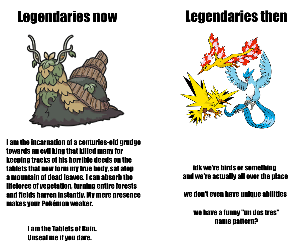 >>59210510That's a good thing. I don't need my legendaries to be special demigods with pretentious """lore""", I just want them to be cool mons I can find if I go exploring in dungeons. Kanto birds are exactly what legendaries should be. Just rare, strong mons you can find as a reward for exploring.