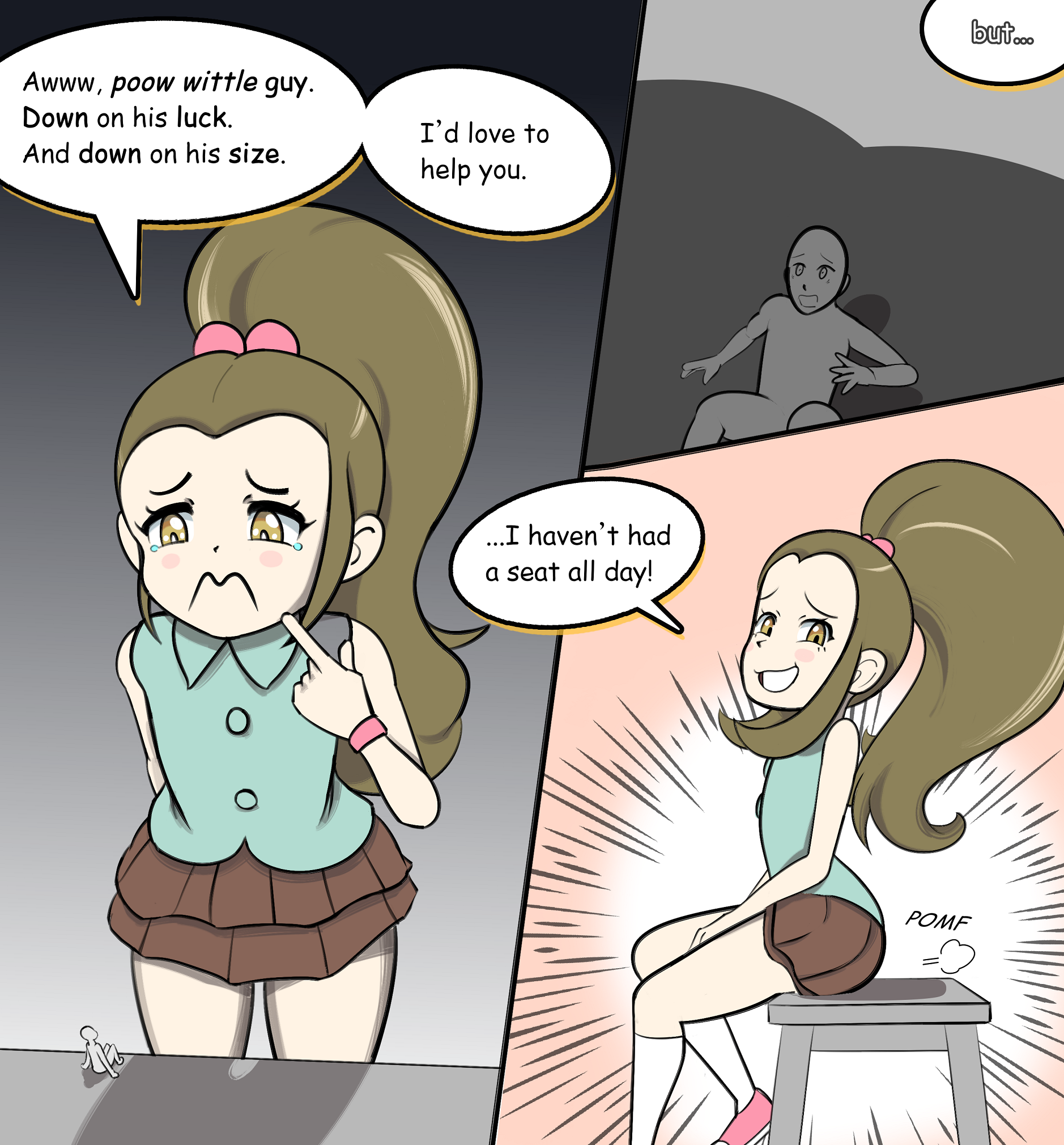 Oh we up ?Taking giant\tiny Serena request>>59211868Diffeinetly shrinking. Bonus points if the giant girl somehow messed tiny's way to grow back to normal by permanently breaking something.