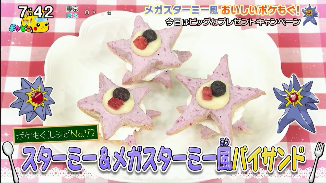 >Freeze the puff pastry sheet, then use a star shape cookie cutter to cut out 3 star shaped bits of pastry from it. Next, make a Mega Starmie-shaped cookie cutter by unfolding an empty milk carton and cutting off two strips of carton 2-3 cm wide, then taping them together into one long strip and folding it into a Mega Starmie shape, with 3 short points and two long ones. Use this home-made cookie cutter to cut out a Mega Starmie-bit of pastry as well, then prick small holes in all the pastry stars with a fork, place them on a baking sheet, and heat them in an oven at 180 degrees Celcius for about 10 minutes. When they're done, separate the puff pastries into two halves each, mix the blueberry jam and 50g of the whipped cream together, and spread this mix on the surfaces of all four halves. Next, put the remaining whipped cream on two of the small star pastries, then place the two other pastries on top of these with the blueberry cream side up. Finally, use custard and the frozen raspberries and blueberries to decorate the top of the finished pies in the shape of Starmie and Mega Starmie's gems.