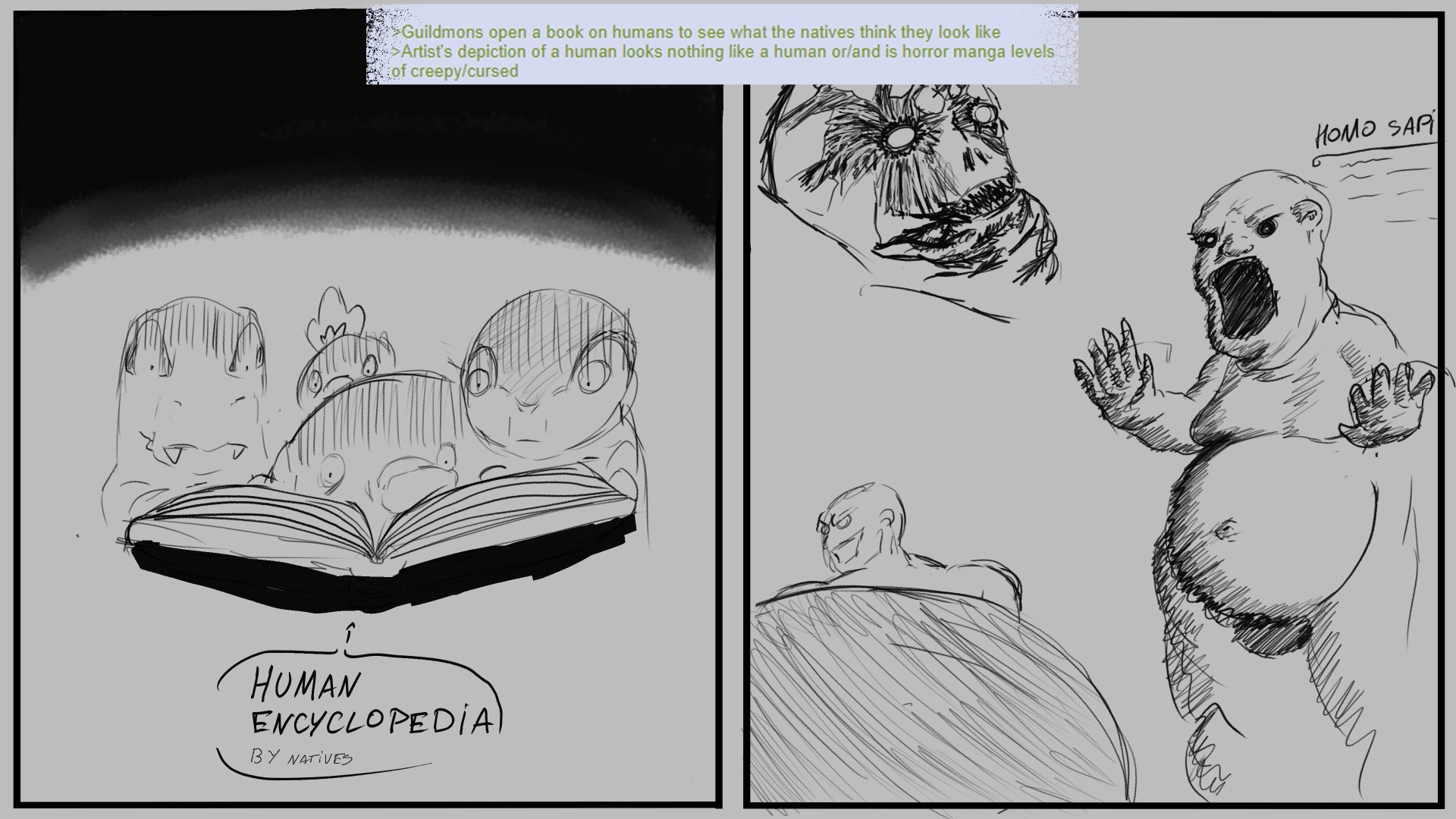 >>59221035>Are there fakemon designs in the PMD world as fictional characters, myths, etcNot fakemon but I like to think that the natives have no idea of what humans look like and depict them very inaccurately.