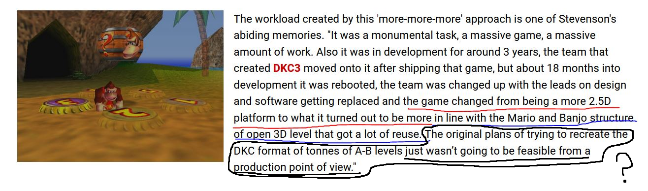 >initially was developed to be a 2.5D game with gameplay similar to Crash Bandicoot>was originally going to be a fast-paced, proper platforming experience with kong-switching and projectile gun mechanics >18 months into development it got rehauled into being yet another cookie-cutter 3d collectathon with a coat of DK intellectual-property paint>game turns out to be no different than a hypothetical Banjo-Threeie >dev team says its because a DKC styled game "wasn't feasible"Just.. why? And do you honestly buy their reasoning? From a programming standpoint, I just don't see in what world a 2.5D game would be harder to develop than a 3D one.