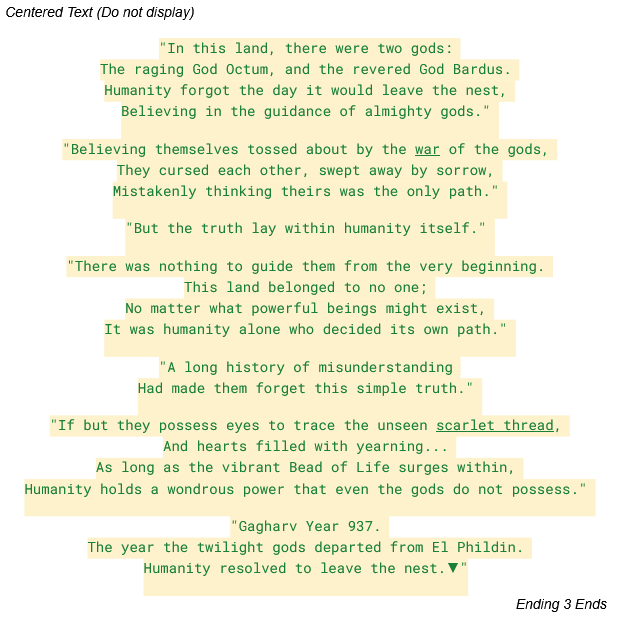 >>12270191Translation Anon from the other month here. I've completed a first English draft of the script I was working on. Some things to point out about that.- I used "英雄伝説IV初期版ゲームシナリオ原本" as the source for the text. This is a book that came with the Red Package edition for the Windows version/remake and contains the unedited script from the *early development stages* of the original PC-98 version of the game. This means that there are some plot points, scenarios and system designs that were not implemented or were later modified in the retail PC-98 version. While the collection claims to be an "unmodified complete version", turns out not all the scripts are present. Specifically, the open scenarios only cover the Guilds in Phildin and Guia, omitting commission events for all other locations (likely because including everything would have far exceeded the book's 400-page limit). Fortunately, the main story remains largely intact; despite minor additions and deletions compared to the retail version, it is largely consistent, so a decent amount of it can still be used for translating the game.- The last third of the book's contents lists some revised scripts, with content that is relatively closer to the retail version. Pic related is the revised ending text; the earlier text was the same except for the underlined words.- Most of the scenario manuscript is organized by town and location rather than chronology. The dialogue of town NPCs at different stages of the story is grouped into a single chapter; for example, the starting village chapter (ED4-4.TXT and ED4-5.TXT) includes not only NPC dialogue from before departure but also the dialogue from the second part of the game.>>12271787The game looks very pretty and the combat is also an improvement over PC-98 White Witch, but man, it's a shame the game got rushed. Looking at the same prairie screens being reused so frequently can become tiring.Anyways, thank you again Anon.