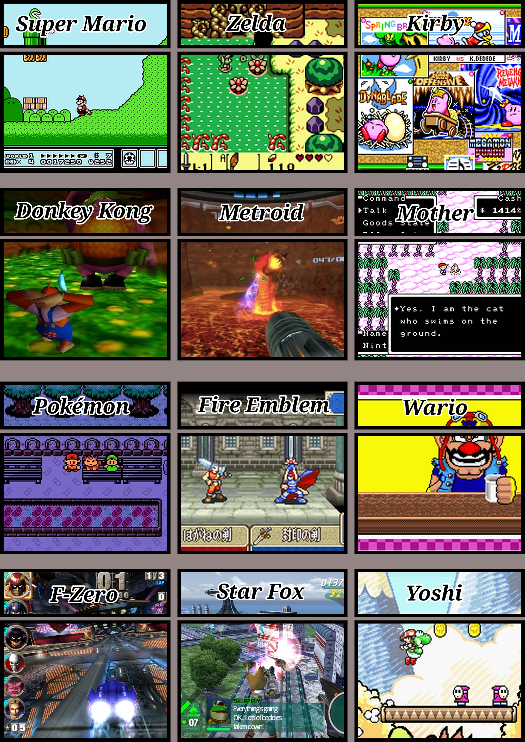Super Mario Bros. 3, A Link to the Past, Nightmare in Dreamland, Donkey Kong '94, Super Metroid, EarthBound, Pokémon Crystal, Fire Emblem (GBA), WarioWare: Touched!, F-Zero GX, Star Fox, and Yoshi's Story.i hope this was helpful, OP.
