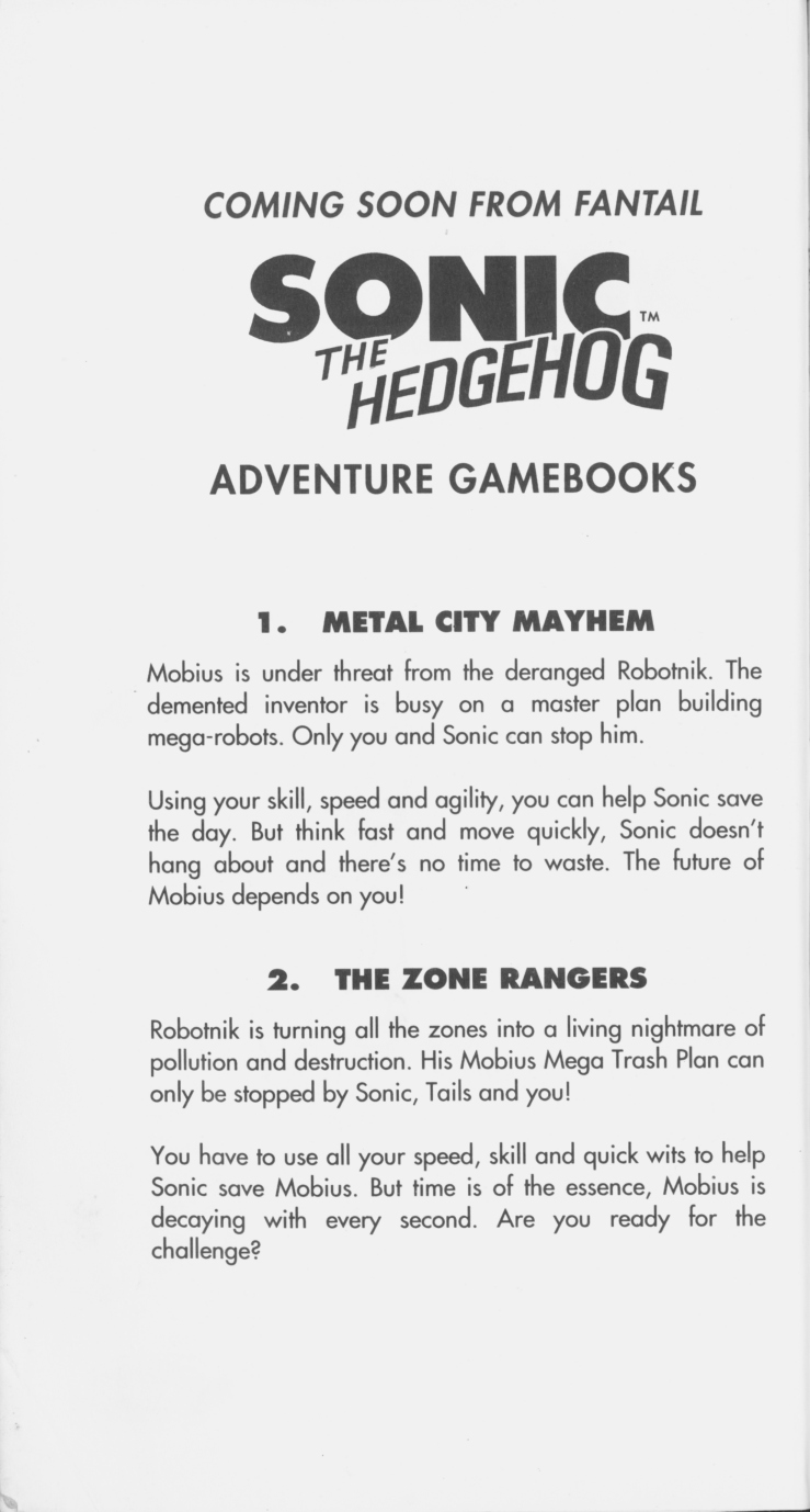 Back in the 90s, Sonic strode throughout Europe like a colossus, with petty plumbers walking under his mega-cool high-tops and peep out to find themselves in dishonourable graves.>Virgin BooksIn Robotnik's Laboratoryhttps://desuarchive.org/vr/thread/12215882>LadybirdAdventure Gamebook 1>>12225519Adventure Gamebook 2>>12232663Adventure Gamebook 3>>12237906>FantailComment too long. Click here to view the full text.