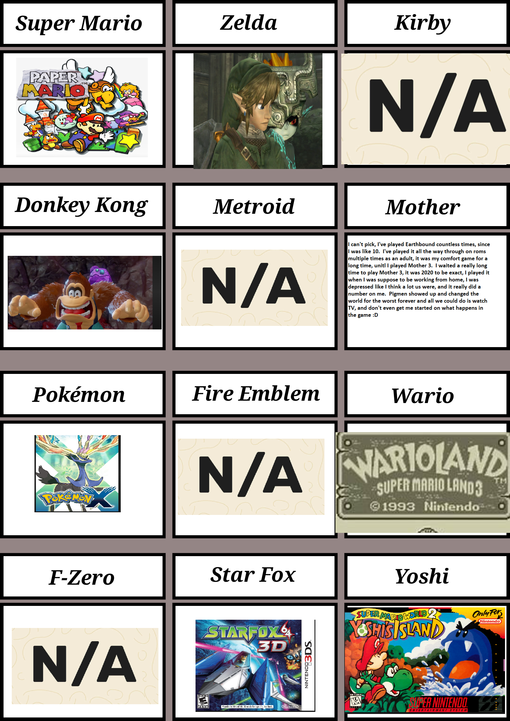 Super Mario WorldOcarinaDream Land 3DKC1FusionMother 1Ruby/SapphireBinding BladeWario Land 4F-Zero XStar Fox 64Yoshi's Island>>12249761>How is SMW2 part of the Yoshi franchise?Comment too long. Click here to view the full text.