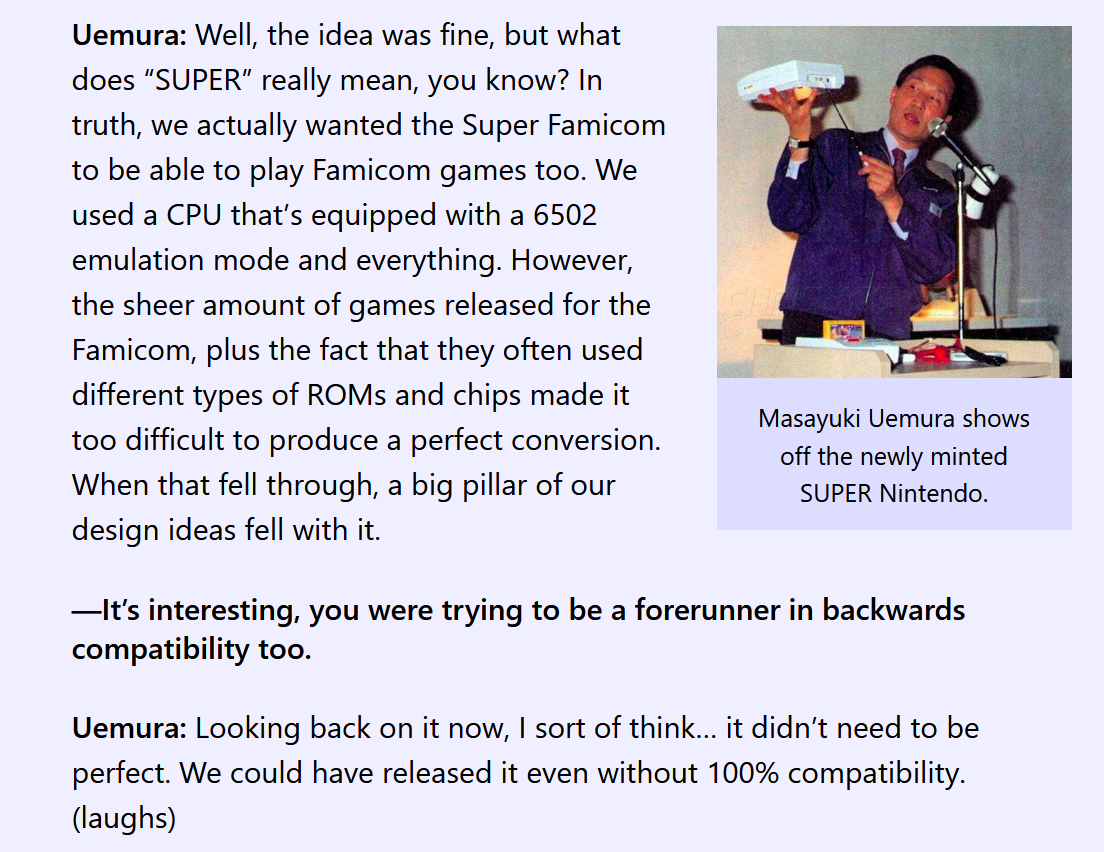 >>11662428they were pissed that SNES wasn't backward compatible with NES