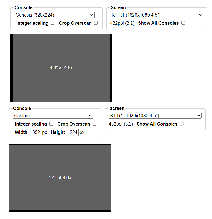 >>11679262The shape looks great. Makes me wish we could get a RG Arc 2 with that screen. Pic is how the two most common Saturn resolutions look on it. Primary Megadrive res too, ofc. admittedly no good for integer scaling, but at such high res scaling outside integer doesn't hurt too much at least