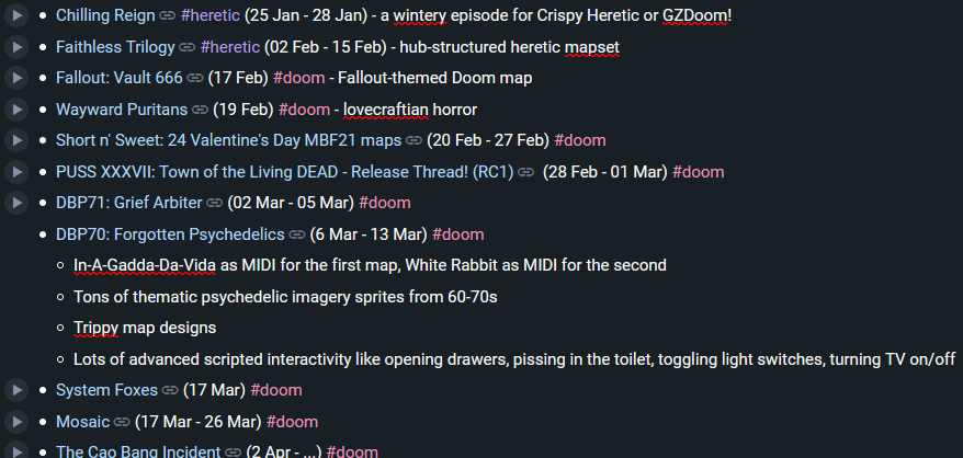 === CURRENT PROJECT ===/Vertex Relocation/ PHASE 2IWAD : Doom 2 | Format : BoomBETA v12: https://files.catbox.moe/2w07up.zipSecrets: https://rentry.co/vertexrelocationsecrets=== NEWS ===[4-03] Vertex Relocation lead may step down due to overworkhttps://desuarchive.org/vr/post/11670074[4-03] Anon shares his yet unfinished Quake 2 hi-res model packhttps://moddb.com/games/quake-2/addons/quake-ii-remastered-hires-monster-and-weapons-packunfinished[4-02] DBP72: Wretched Morrow is out now!https://doomer.boards.net/thread/3931[4-01] Gossip, the set of huge and confusing levelshttps://doomworld.com/forum/topic/127080[4-01] Void 2, the sequel to classic conversionhttps://moddb.com/games/doom-ii/addons/void-2[3-31] Earthless sees a (semi)final releasehttps://doomworld.com/forum/topic/152166[3-30] Eclipsed: Zandro mod by Mace, releasedhttps://theatommace.itch.io/eclipsed[3-25] The Cao Bang Incident by Nicolás Monti, releasedhttps://doomworld.com/forum/topic/152033[3-24] Mine Jam for Quake 2, releasedhttps://moddb.com/mods/mine-jam-1[3-23] Initial release of a port of Mac Wolf3D to DOShttps://github.com/FrenkelS/Wolf3D-Mac-for-DOS/releases[3-23] The Force Engine v1.22, includes editor & demo replayhttps://theforceengine.github.io/downloads.html[3-21] HDoom update, Revenant & gameplay options addedhttps://drive.google.com/file/d/197tg35i1tOaFPwg37NY57eFgRQf_6HDJ/view[3-21] Serious Sam: TFE prototype build (Oct 23rd, 2000)https://archive.org/details/ss-tfe-internal-test-v010-2000-10-23[3-19] Tax Evasion 3D, releasedhttps://doomworld.com/forum/topic/151936[3-16] GMOTA v1.8.4, releasedhttps://combine-kegan.itch.io/gmota[3-15] Lonesome Road by tourniquet, releasedhttps://doomworld.com/vb/thread/151858=== PREVIOUS ===https://docs.google.com/document/d/1-vrTgPGmlLwdO5VHHCJMxmRD05E6XlNmqHIN8aykRG0TO SUBMIT NEWS, REPLY TO THIS POST (ideally with the [mm-dd] date bracket)