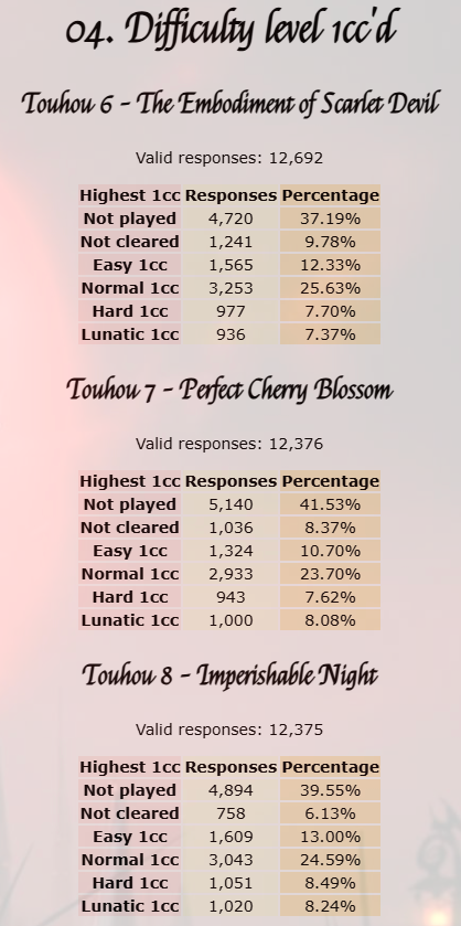 >>11688851If we're going to be charitable and interpret getting a normal mode 1cc as "seriously playing", then that's still only 3,000 people. There are ~300 million people in the world who claim to be touhou fans