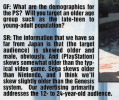 >>11698456This is interesting, I've always felt that way especially if you look at the first 2-3years of games on PSX. It wasn't until years later that the PSX really started to target pre-teens.Basically, unlike what disingenous posters with their "lol kids games" argument like to pretend, there were *always* two audiances, the pre-teens and and the young adults. The pre-teens may have been numerous but the ones pouring the most money into the industry were always the young adults, not the kid with no money who got 2 games a year. This is corroborated by what he says on the last page about "being here thanks to the enthusiasts".Also he's claiming he's not bringing Motor Toon because it's "too juvenile" so they were really heavily leaning towards the maturity image here>>11698458The part how Sega and Nintendo have to spread their marketing towards several platforms but they only focus on a single one is also interestingalso everyone really believed integrating FMV to the gameplay was a future for video games