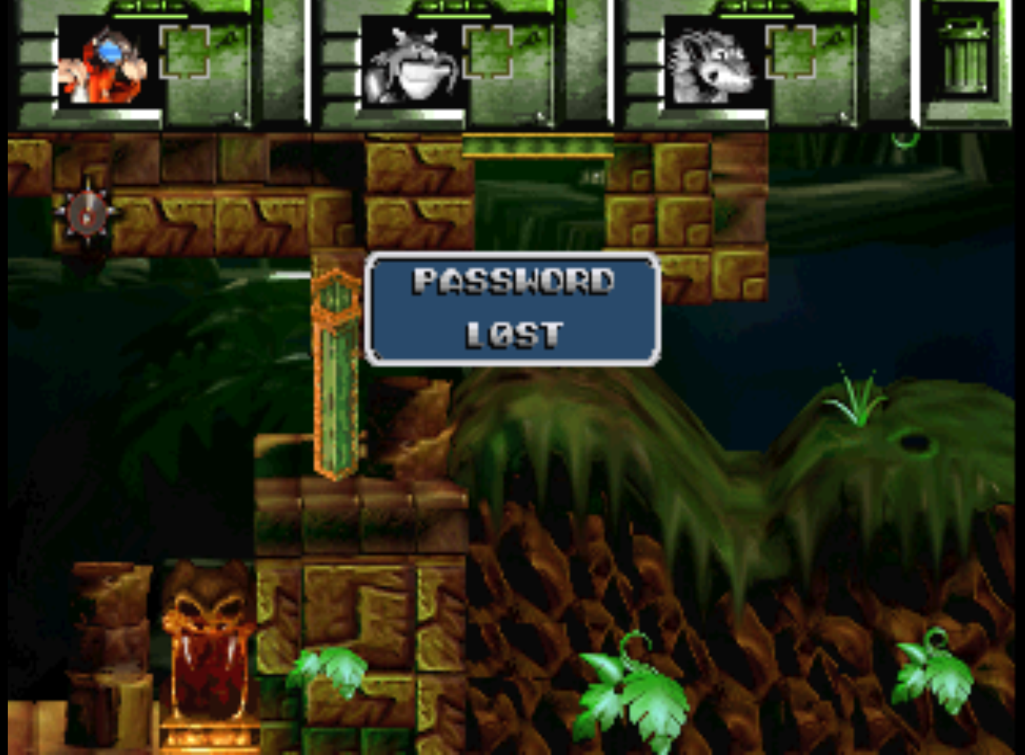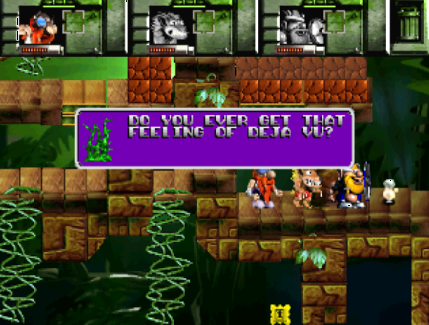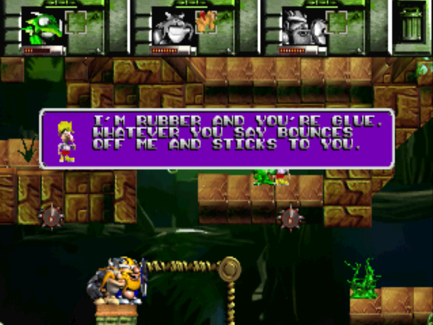 If you fail a level a couple times, the next time you start the level the characters will have a short conversation about their failure. In this level there's some retarded glitch where Baleog's text box and voice appear, but instead of a picture of him it's a picture of one of the random plant enemies, and Baleog isn't even in the level to begin with. What the fuck lmao.