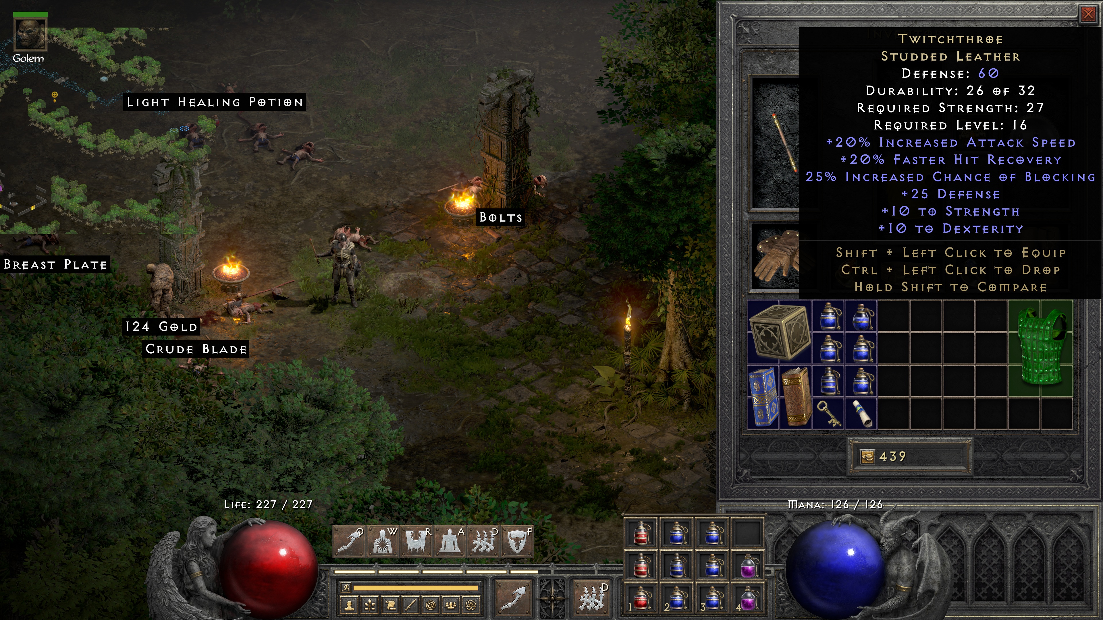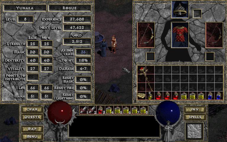this anon >>12077423 againI started playing diablo 1 today, it was simple but very fun! I chose rogue since it seemed more interesting than warrior and sorcerer seemed like something you play after learning the game. I also activated the hellfire classes in the settings but I didnt want to start with them.what first surprised was how little there was stopping me from just going straight to that cathedral and getting to the main gameplay, felt like I was skipping something after talking to all the npcs lolis rogue the easiest class? I've only used the starting bow and a hunter bow found and combat has been fairly easy, I'm assuming melee or relying on magic is the standard choice I guess. learned three spells and got one to level two but my best one is the disarm trap one I started with, already dealt with two trapped chests and a door.I stopped playing after clearing level 3, ended up with a full belt of potions, many were the yellow kind after touching an eldritch shrine, and another line of them in my inventory, a helmet with 20% light radius, a quilt chest piece that improves my armor rating by 35%, and a staff of the firewall spell that looks pretty strong but I don't see myself opening up my inventory and equipping it during combat so should I sell it? also I leveled up vitality to 25 but somehow it shot up to 27 randomly, got strength to 20 for the hunter bow, magic to 30 since I wanna try the spells and read books, and my dex is at 40.my only questions are what else the stats do, are they just for weapon requirements or does having more strength as a bow user do something? my hit percent is past 100 so idk if that does anything extra and how many potions is enough? like I said I have a belt full of the minor yellow one, a minor red, and a scroll. there's four more minor yellows in my bag, a max yellow, two max red ones, and two minor blue ones.