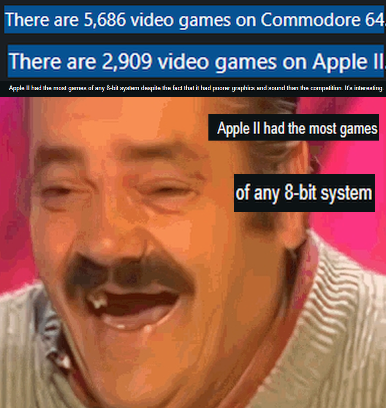 >>12092138> There are 5,686 video games on Commodore 64https://www.mobygames.com/platform/c64/>There are 2,909 video games on Apple IIhttps://www.mobygames.com/platform/apple2/>Apple II had the most gamescringe