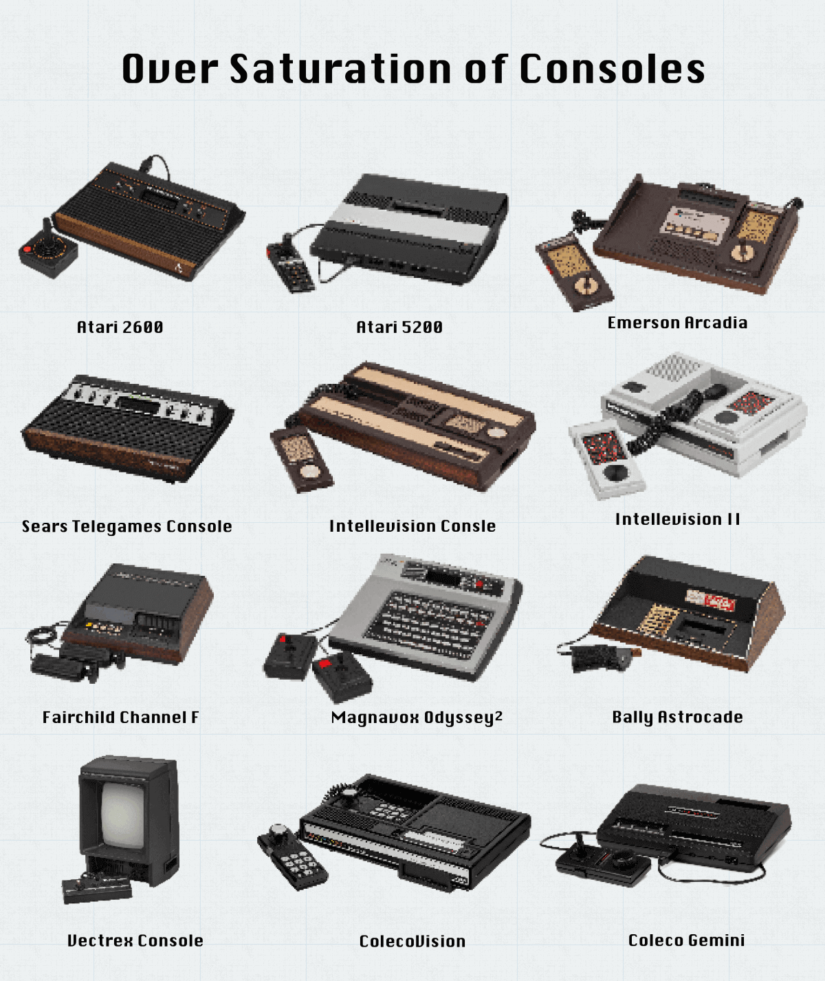>>12096393The Sears Telegame was literally a rebranded 2600 which Atari made for Sears to sell. For the others, pretty much only the Colecovision and Intellivision had any worthwhile market share.Probably the biggest contributor to the crash as a whole was Atari realizing that, oh no, making more stock than you can actually sell, and not trying to gauge your fucking market, isn't good. Thus they tried to push off their excess stock (of all kinds of games and hardware, not just E.T like the legend says), to try to stop bleeding money, which then spooked retailers and distributors who weren't even done selling what they had received.