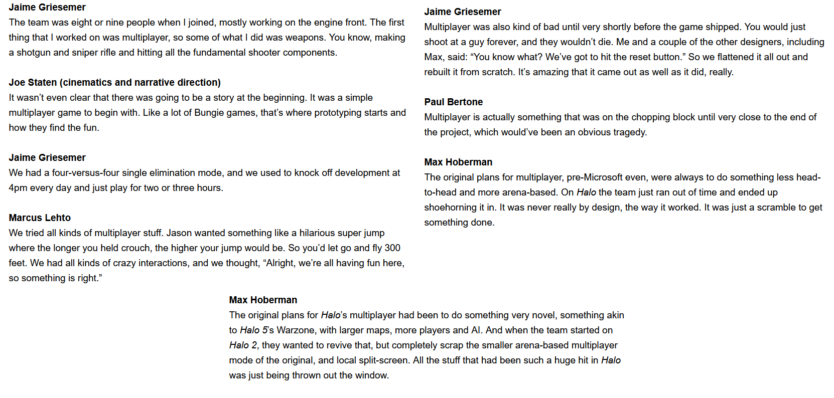 >>12094238CE's multiplayer was rushed together last minute (the game was only going to be single player) and according to Hardy LeBel, the main designer for it, the multiplayer was just supposed to be a party shooter/couch multiplayer game more akin to Mario Party than something competitive like you'd see with other FPS titles. It wasn't until Max Hoberman took over for H2's multiplayer where Halo MP became more competitive focused so spawn balancing was improved after they saw the popularity of CE's multiplayer.