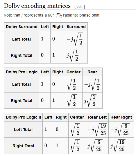 >>12095104>>12096982>play a sound through a center channel>just play the sound at equal levels through left and right channels>play a sound through one or two rear channels>matrices, square roots, and negative imaginary numbersMagic. Got it.