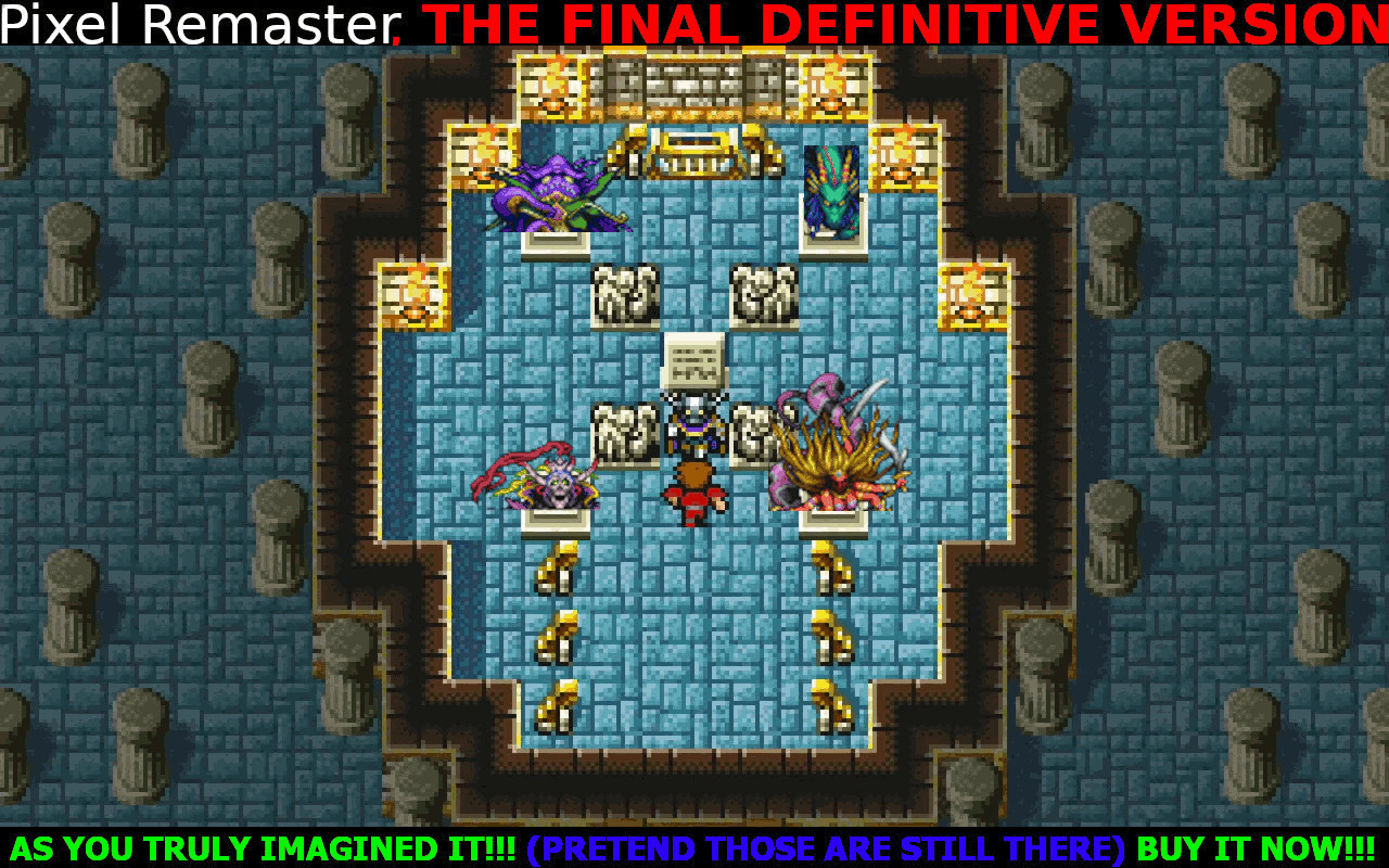 >>12095809PSX is after WSC retard>you're never in danger of dying even from the final boss.The final boss went from 2000HP in the original to 4000HP in WSC to 20000HP in GBA and the completely random action order in Pixel Remaster means it can do back to back party wide AoEs before your heal goes off and murder your shit unless you are leveled way up. Or you could get lucky the first time, whichever.>>12095880I actually kind of hate some of the PSX music personally. >>12095659 is amazing, and incidentally WSC is a handheld shitified version of it.