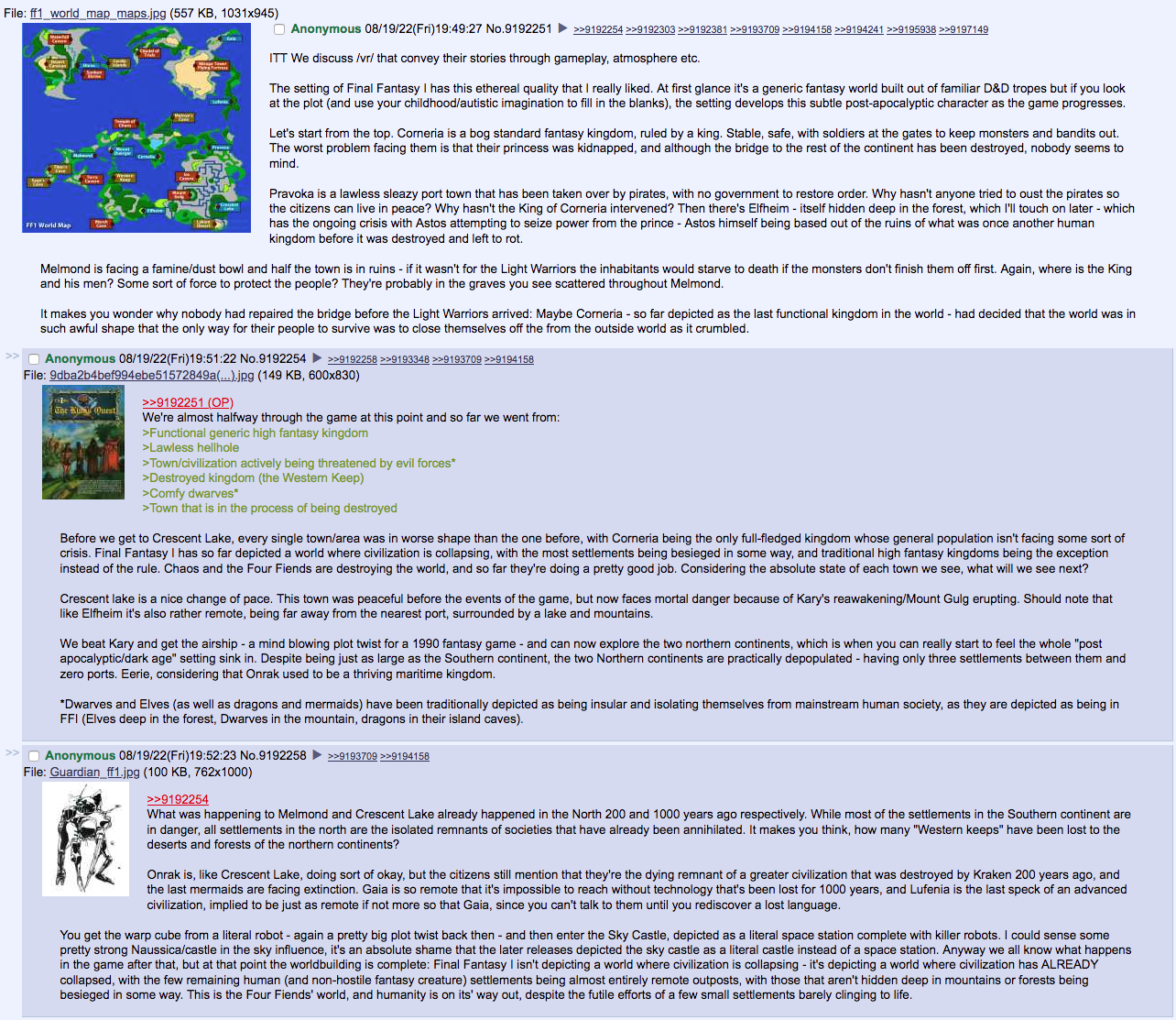 >>12100276>but skip 8Nah, I think 8 is worth playing if only to form your own opinion on. The first disc starts strong and is really ambitious. The problem is that it subverts a bunch of traditional JRPG/FF expectations in the name of innovation, but ultimately only succeeds in replacing one form of "grinding" with another, and ends up destablizing the formula by removing most of the player's incentive to do anything besides grinding. Which is funny for a game that people champion as "le only FF where you don't need to grind!"It's probably my least favorite FF of the ones I've played, but it has an extremely unique atmosphere and a lot of interesting ideas, even if few of them pay off. The pre-rendered backgrounds are gorgeous, and the FMVs still hold up today, which is impressive. You can really tell Square was shifting gears to become more of a visual media company here—it's not surprising they made a full length CGI movie just a few years later.