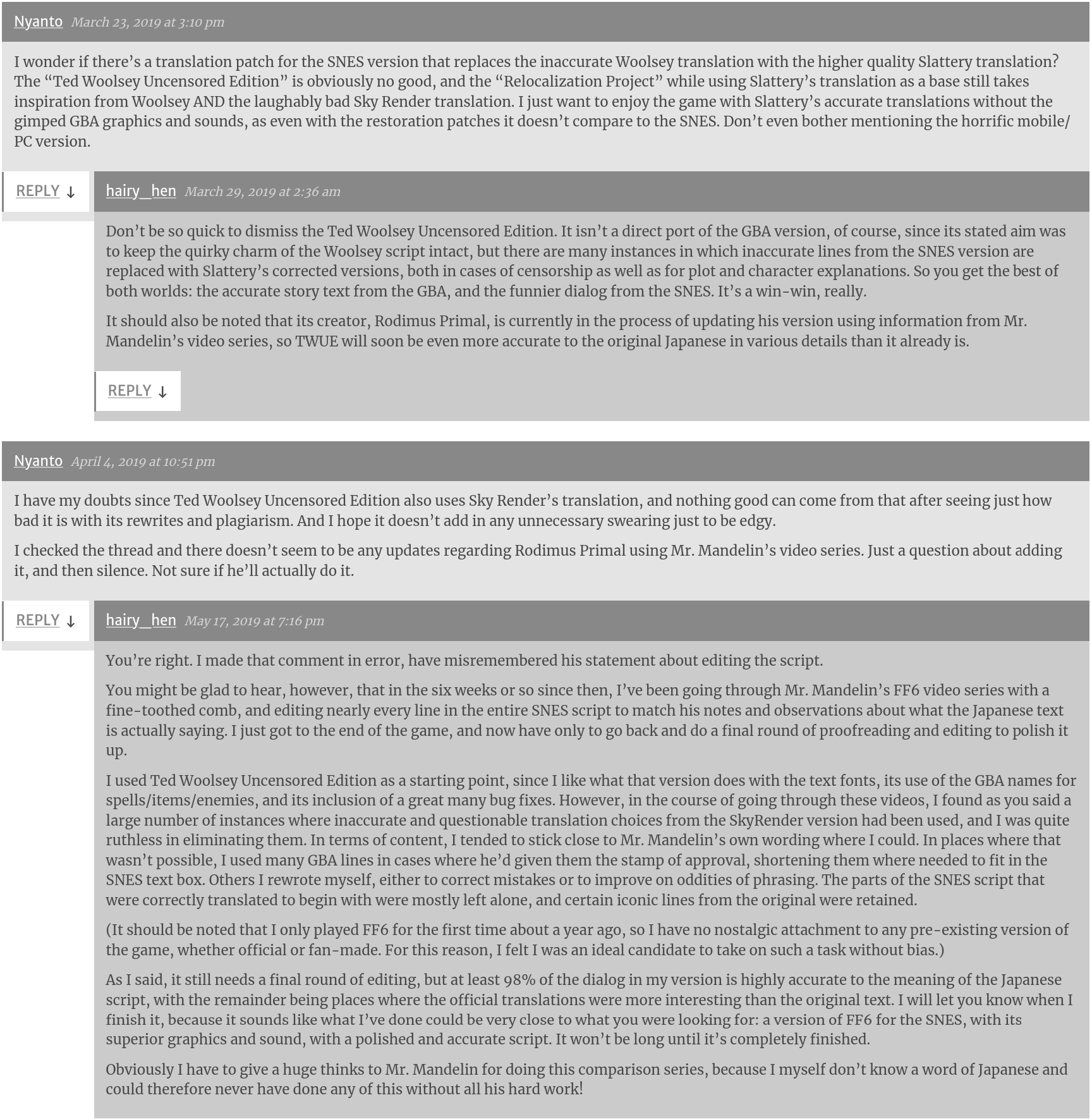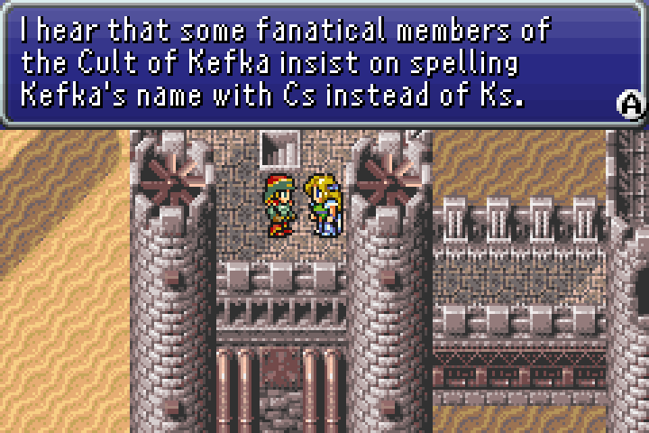 >>12105614That was literally the whole schtick of Ted Woolsey Uncensored Edition.>Release a (very bad) "uncensorship" hack based on the old RPGOne/SkyRender hack that the hugbox seals at RHDN lap up>Legends of Localization then releases an analysis of Final Fantasy VI (& IV) that denounces the old fanhacks as full of shit>Tomato fanboys dogpile TWUE for its reckless idiocy behind the scenes; now everyone and their mother scrambles to fix the mess he caused>he just undoes practically all the early-2000's ideas of "uncensorship" - but he makes sure to do it -incrementally-, only after someone else makes yet another fork of his hack to match sure his original hack stays on top of the recent list; all this does is make it more and more like the vanilla version>most normal people just give up sorting through the forksIs it a decent hack now? Maybe - after years of slowly undoing his bullshit every time he felt threatened by someone else taking his crown.