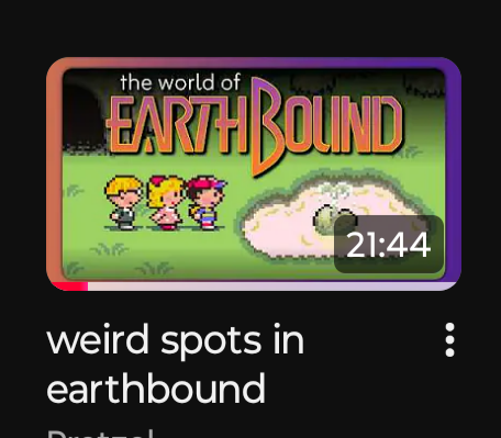 >made a thread here on /vr/ last week about favorite strange/uncommon places in games and used the way to Milky Well in Earthbound as an example>Suddenly see this on my YT feed, uploaded 3 days agoI should copyright my threads dammit.