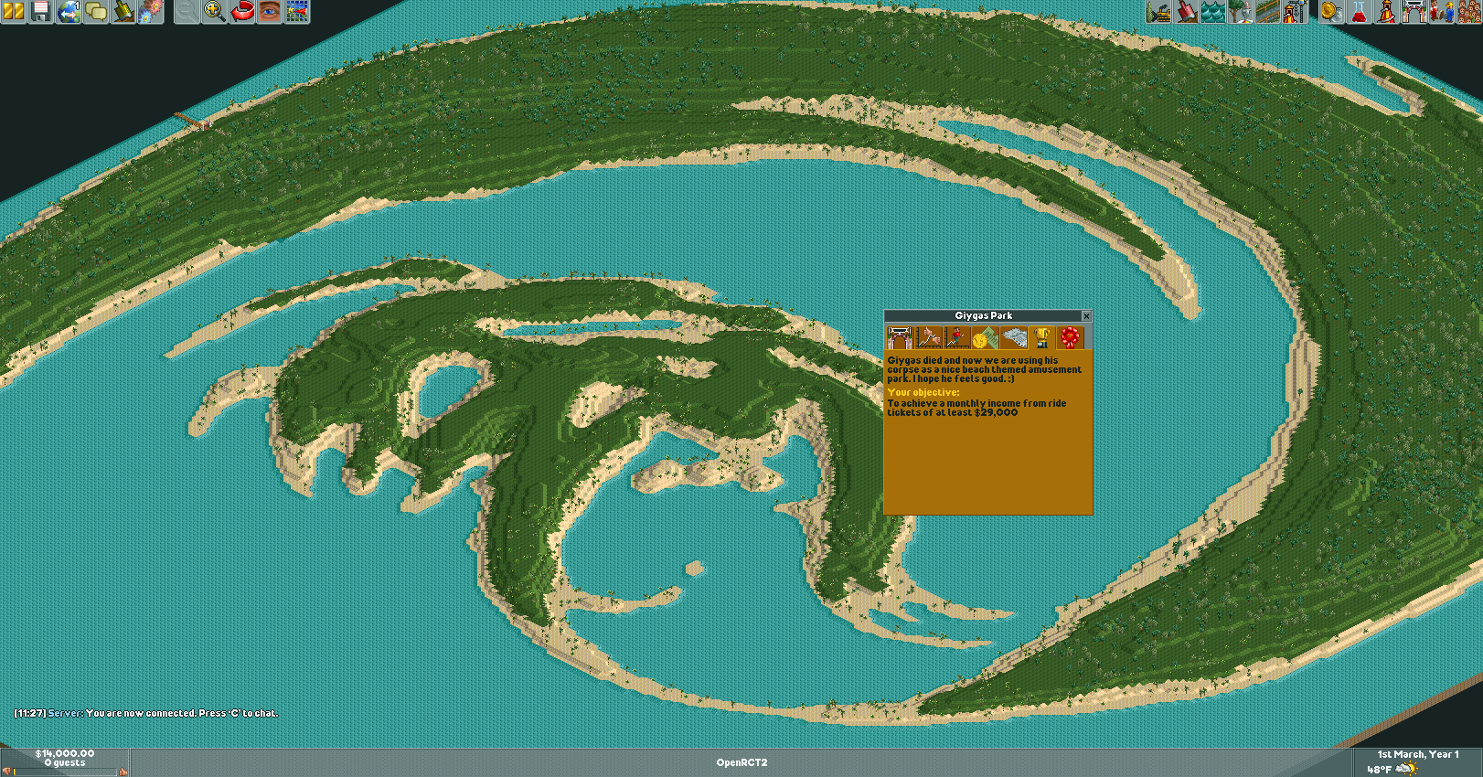 last thread:>>12071428 last weekend map download:https://files.catbox.moe/5qquuh.park Awesome Downloads: >OpenRCT2 - Currently the best way to play RollerCoaster Tycoon. We use the latest stable version for multiplayer unless otherwise noted: https://openrct2.org/downloads >UCES - includes all objdata files already extracted from each scenario upon loading, and includes tracks: http://www.mediafire.com/download/7wcrq3xl266d1bj/UCES.zip >Amazing Earl stuff - adds some custom-made rides and scenery: http://www.mediafire.com/download/f3jzct5v8kbzdfj/AmazingEarl.zip >Anon's devkit v0.2 https://pastebin.com/y857FdJH >4chan Kit v0.3 https://www.mediafire.com/file/dtzvwbcngrh0ghi/4chan_kit_v0.3.7z/file >/vr/ct RCT1 Collab https://files.catbox.moe/gldfii.zip - - - - - - - >Knowledge Base https://web.archive.org/web/20160807005625/http://www.rctstationarchive.com/knowledgebase/index.shtml >RCT1 Manual http://replacementdocs.com/download.php?view.1111 >RCT Sites Archive https://archive.rctspace.com/ >Headless Server Guide (PLEASE fix it) https://pastebin.com/smsQWZtB >Weekend Parks Archive (Needs updated) https://files.catbox.moe/2h17nx.rar >Current state of weekend multiplayer: welcome to the bronze age