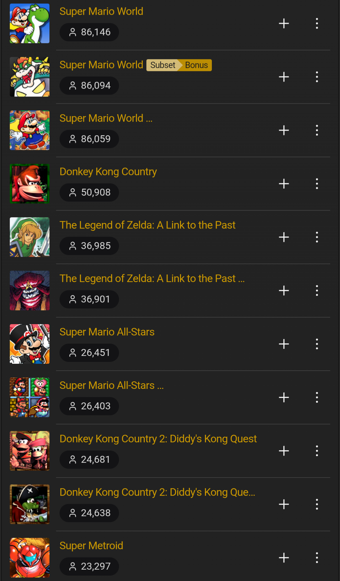 >>12116573>SMW repeated 5 times>ALTTP repeated twice>DKC repeated 3 timesThat's actually a top 4 list, and cheevofags are not reflective of normal people