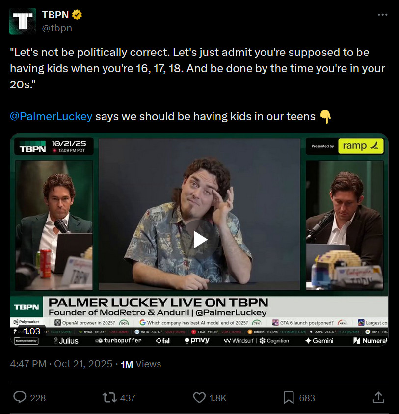 Solely from a biological point of view, you are supposed to have kids non-stop until mother reaches menopause, then father should ditch her and switch to another much younger woman, producing offspring continuously until he dies from old age. Not "be done by the time you're in your 20s" like this chump proposes.