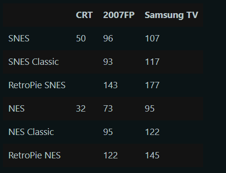 >>12142067this is actually pretty interesting, from what I'm gathering from multiple posts about people testing latency with original hardware on crts it seems to hover around 50ms. I haven't looked into it in detail but it seems like it could be possible to actually have the same or less lag than original hardware with oled and properly configured run ahead settings.