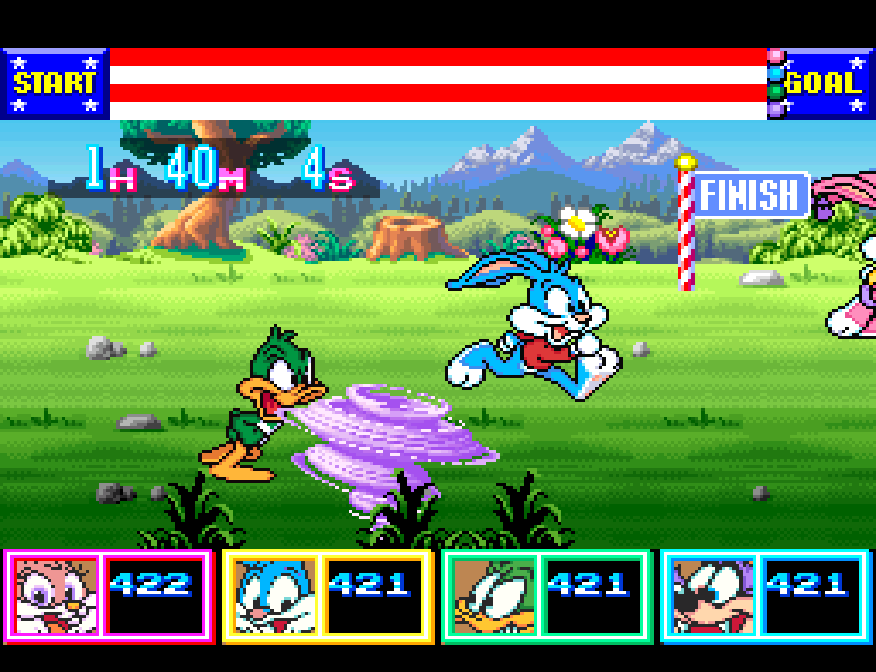 Tiny Toon Adventures Wacky Sports Challenge has a mini game where you have to button mash for an hour and 40 minutes. Did the devs actually expect anyone to beat this? Anyways, this was a pretty decent mini game collection game if you use a turbo controller.
