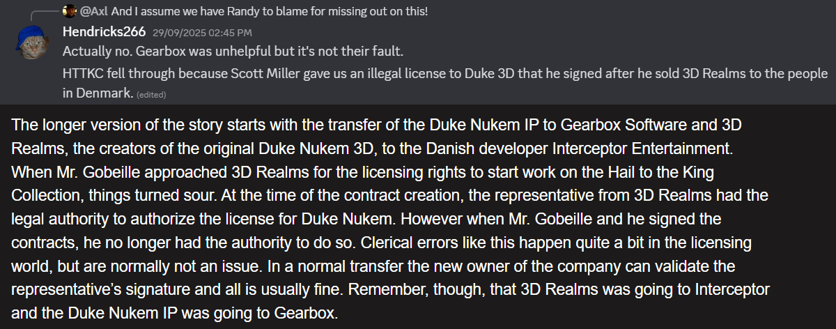 >>12233253>Of course they would avoid Duke like a plague after having to deal with lawsuits over Scott Miller's shitty deals.I neglected how things were at the time.https://forums.duke4.net/topic/12402-duke-nukem-now-owned-by-take-2-as-embracer-group-sells-gearbox/ Not sure how better things would be now.>>12233279>"here's a good chance this post or all my posts will get deleted... but I bet my bake won't lmao.">bake AND posts get deletedA bunch of other innocuous posts were deleted, too, so they were either involved with shitflinging further along in that thread or they too were sir https://warosu.org/vr/thread/12060373#p12062896 That also includes the posts discussing and approving more 'graph updates https://warosu.org/vr/thread/12060373#p12061864Either way, biggest btfo we've seen in awhile.>I don't think we have new janitors yetAt least not strictly /vr/ ones. Even this thread has been tidied up https://warosu.org/vr/thread/12231113#p12231156 there's still occasional moderation but not as strict as it used to be.