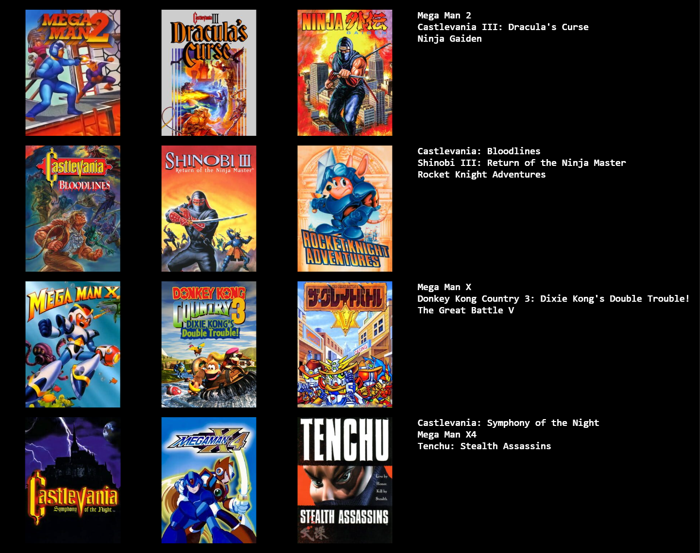 >>12250867Oh yeah honorable mentions:Adventure Island 3Sonic 2Super MetroidDino Crisis