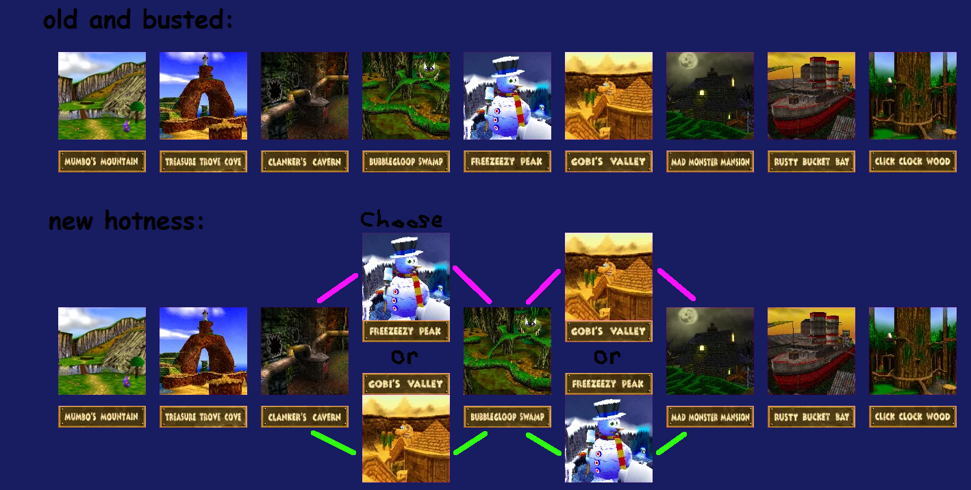 >>12254491yeah exactly. And freezeezy only has a single pair of boots outside mumbo's house that could easily be changed for a fly pad if they swopped the level order. bubblegloop would be a lot more appreciated if it was a break between the hot/cold extremes rather than immediately after another gross stage. the contrast would feel way better