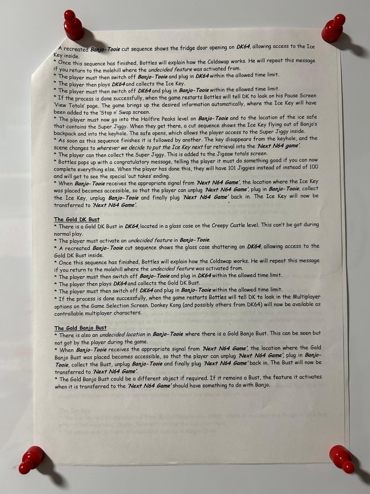 Obviously not really new info for the Banjo stuff but the DK64 bit is interesting since it was only ever speculation up until now. I think Rare devs had said it would have been one of the Stop n Swap games but nobody really knew how or why. Also wow, this document is dated just about 3 months to the day DK64 released, that means we were so unbelievably close to getting it. Accounting for manufacturing and distribution times which were much longer in those days, them gutting Stop n Swap from the game may have very well been the literal last thing they did during the final days of development. Also the Banjo statue is entirely new information that's really cool.>>12264537>memory card uncommonI don't think you realize like 90% of the N64 library required it to save because every publisher that wasn't Nintendo were too cheap to include cartridge save memory. Most people had at least one.
