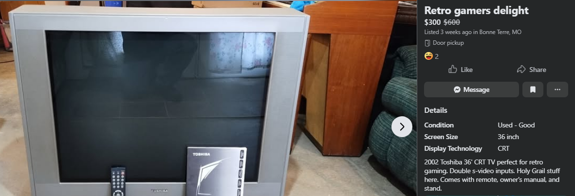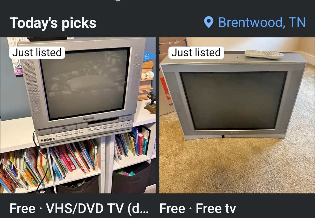 >>12275596Yes, there's a flipper in Murfreesboro with delusional pricing. You may have seen his listings. Also a good number of free CRTs around though.