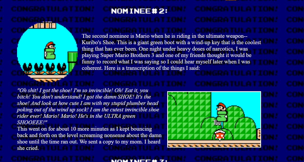 >>12275498For Super Mario Bros. 3 (the real Super Mario World) I'd say level 2 is pretty fun with the pyramids and the map screen is as cozy as fugg with the Roman numeral III forming an oasis to the far right of the screen after you smash the rock. That moment is magical.