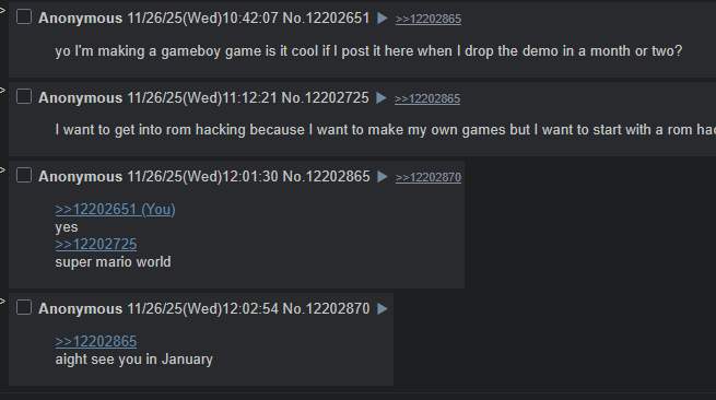 >>12291230I made a Gameboy Color game, check it outhttps://ralphnemesis.itch.io/mousemanDownload the rom, don't play in browser. I just put that there for invalids.