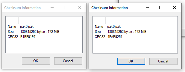 >>12297160I compared id1 pak file with the last version before this update, and the contents is identical, all the files inside it are identical (used PakExplorer to extract everything), yet the .pak files themselves have different checksum (yet same filesize). No idea the hell is this update, probably some .pak metadata changed (if it has any).
