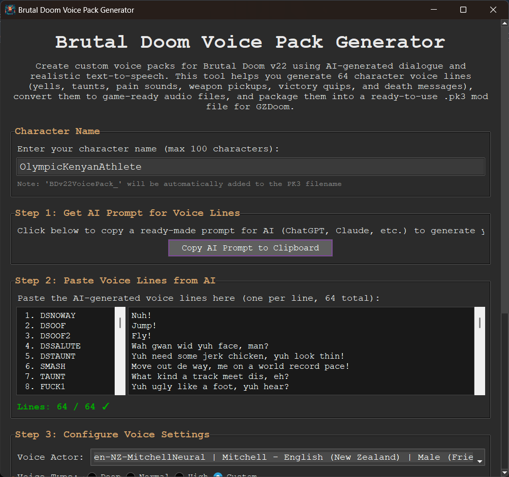 >>12304583>>12304579I'm a coder tool builder and I like to explore mass production of content. Thats just random settings thrown together for sake of screenshot.You can test out some voicepacks I made in this collection:https://reactorcore.itch.io/brutal-doom-voicepack-collection