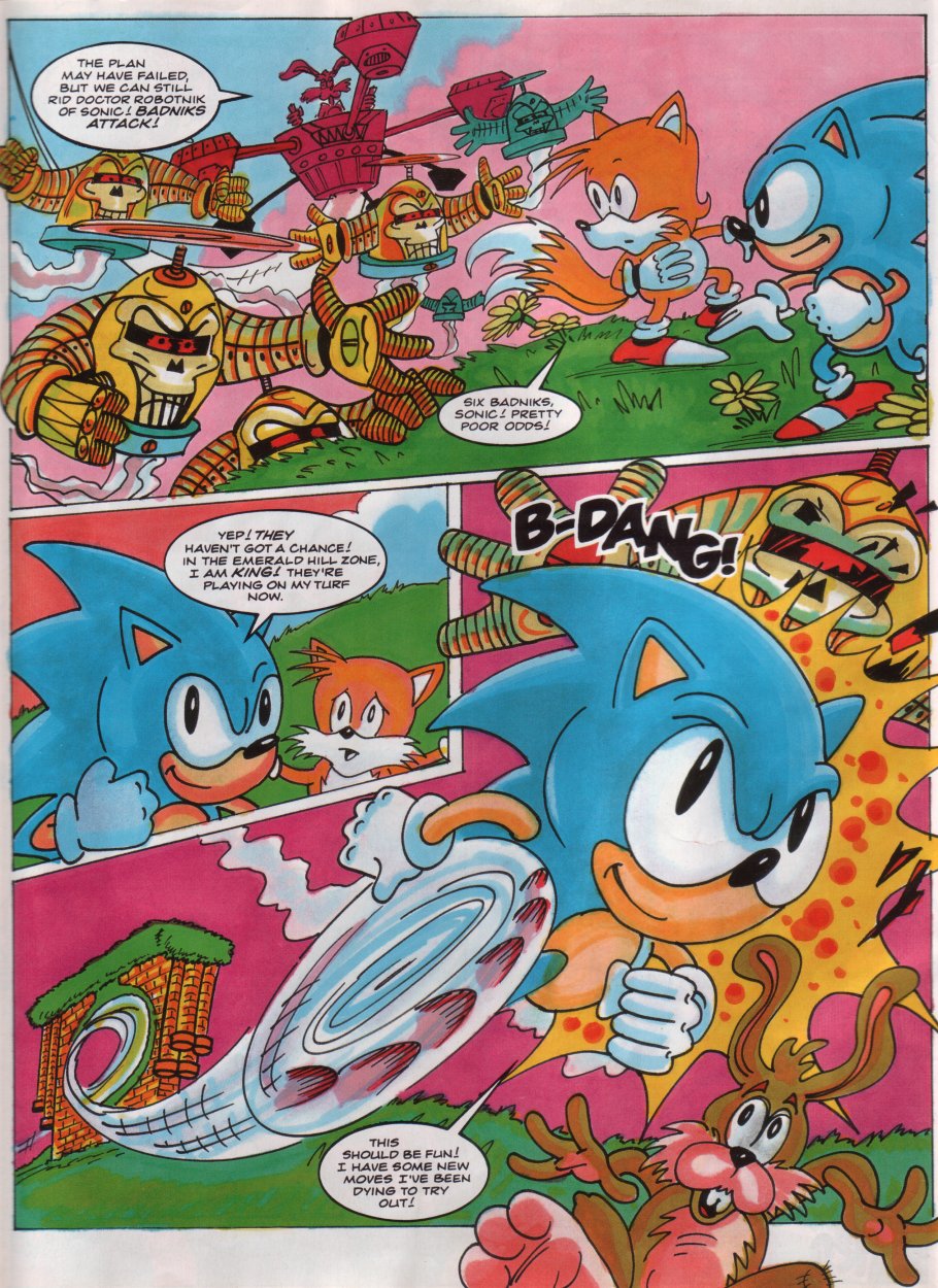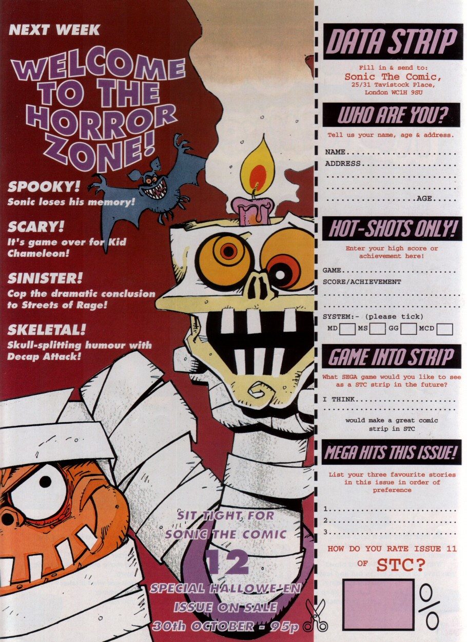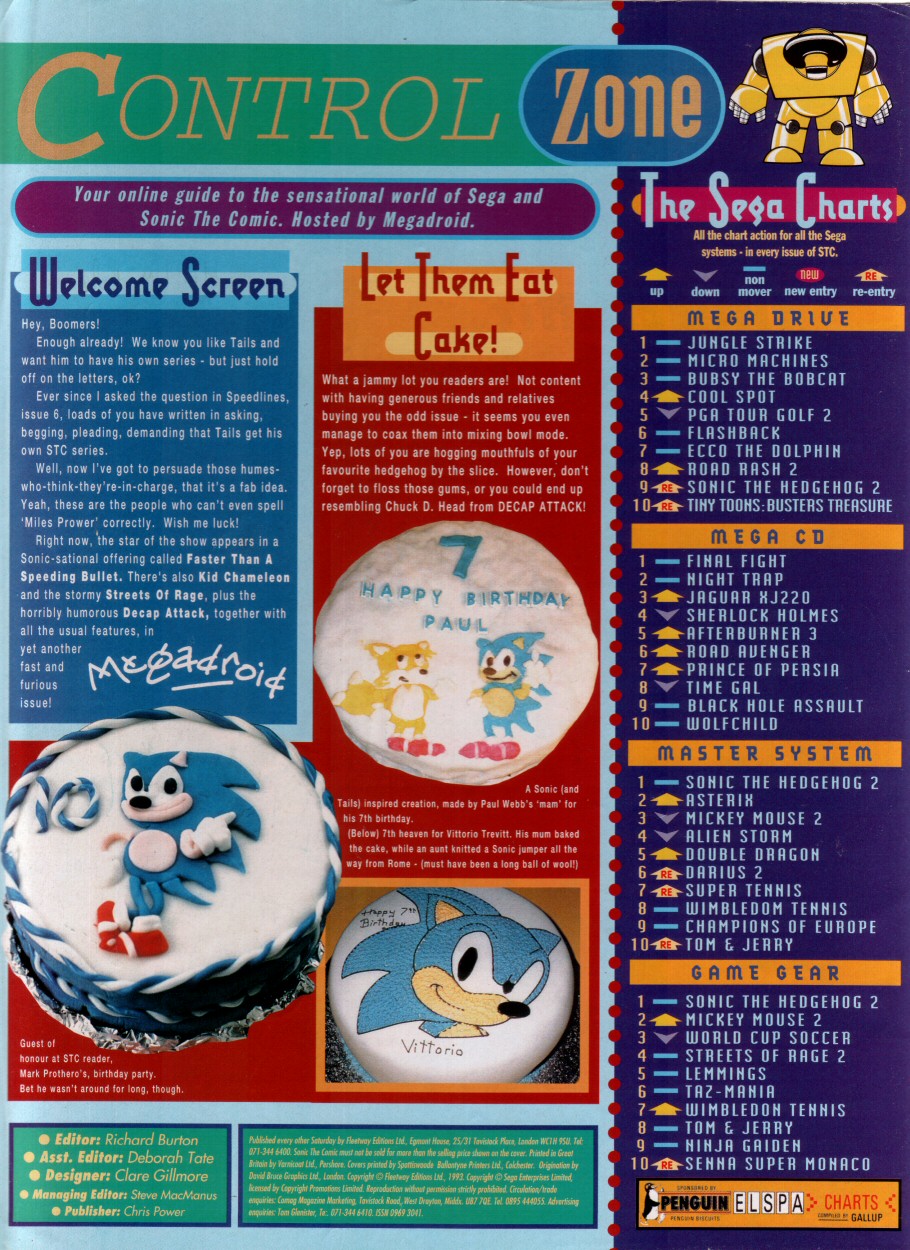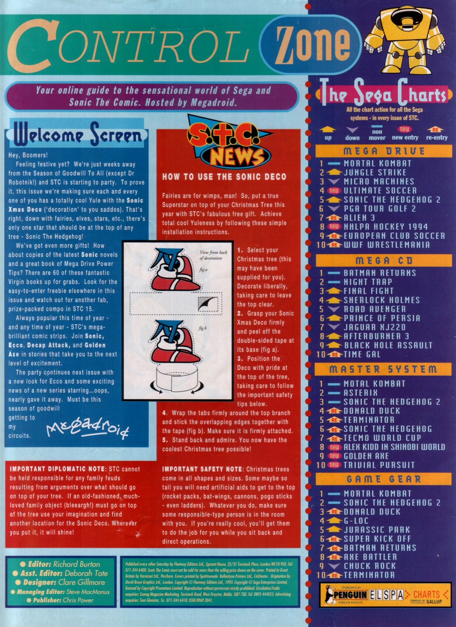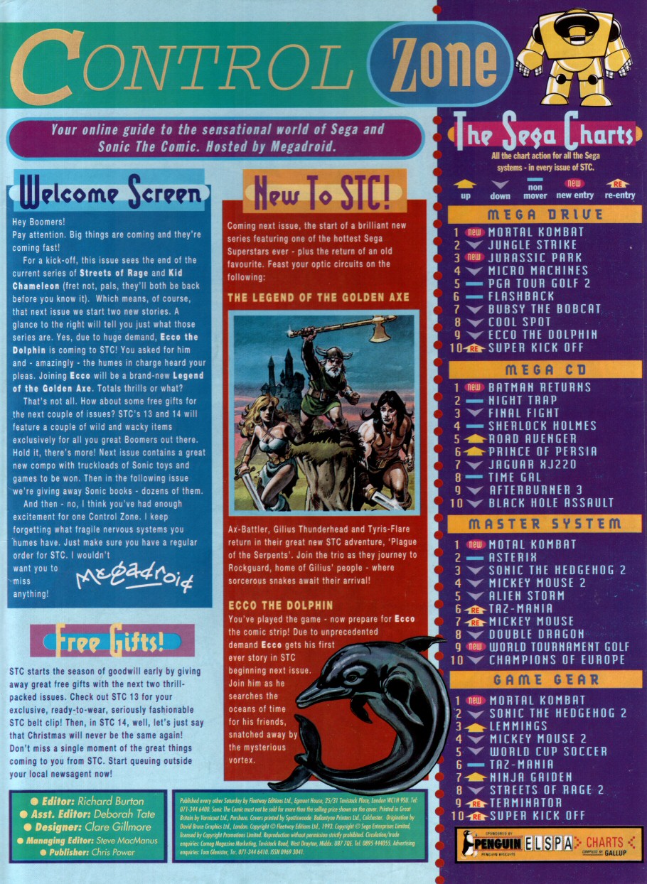 Title: Sonic The Comic #12Type: Regular SeriesDate: 30th October 1993Published By: Fleetway Editions Ltd.Scanned By: Ezekielhttp://stc-archive.gue-network.comEditor: Richard BurtonAsst. Editor: Deborah TateDesigner: Clare GillmoreManaging Editor: Steve MacManusPublisher: Chris PowerContents:Page 1 Cover Artist: ??Page 2 Control ZonePage 3-9 Sonic the Hedgehog - Hidden Danger! Script: Mark Millar Art: Carl Flint Lettering: Ellie de VillePage 10-12 Review Zone Reviewer: Vincent Low Reviewer: David GibbonPage 13-17 Kid Chameleon (Part6) Script: Michael Cook Art: Brian Williamson & Steve White Lettering: Tom FramePage 18-19 News ZonePage 20-24 Streets of Rage (Part6) Script: Mark Millar Art: Peter Richardson Lettering: Tom FramePage 25-26 Q Zone - Q&A Special Game Guru: David GibbonPage 27-30 Decap Attack starring Chuck D. Head! (Part3) Script: Nigel Kitching Art: Nigel Kitching Lettering: Steve PotterPage 31 SpeedlinesPage 32 Next Issue