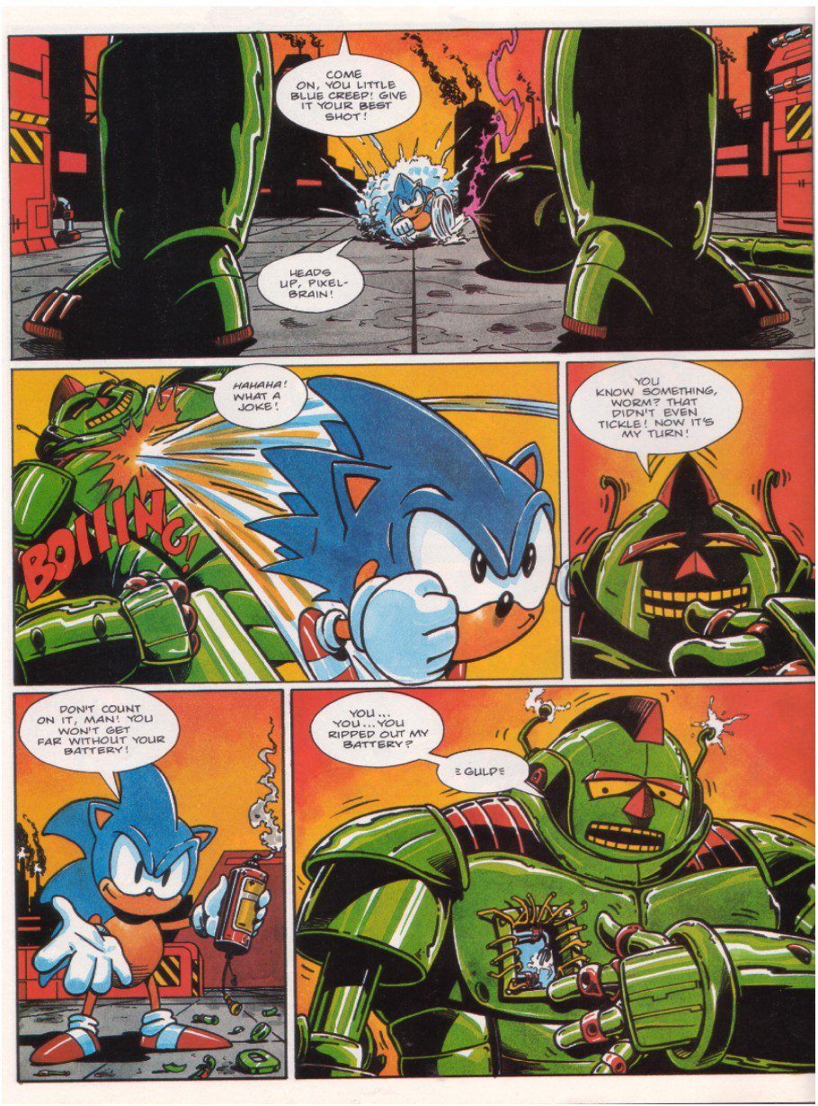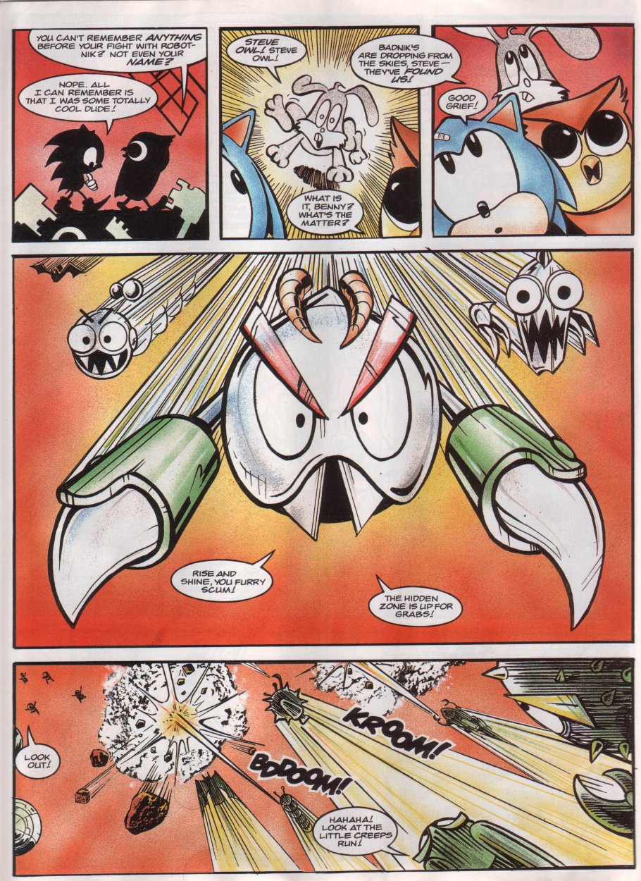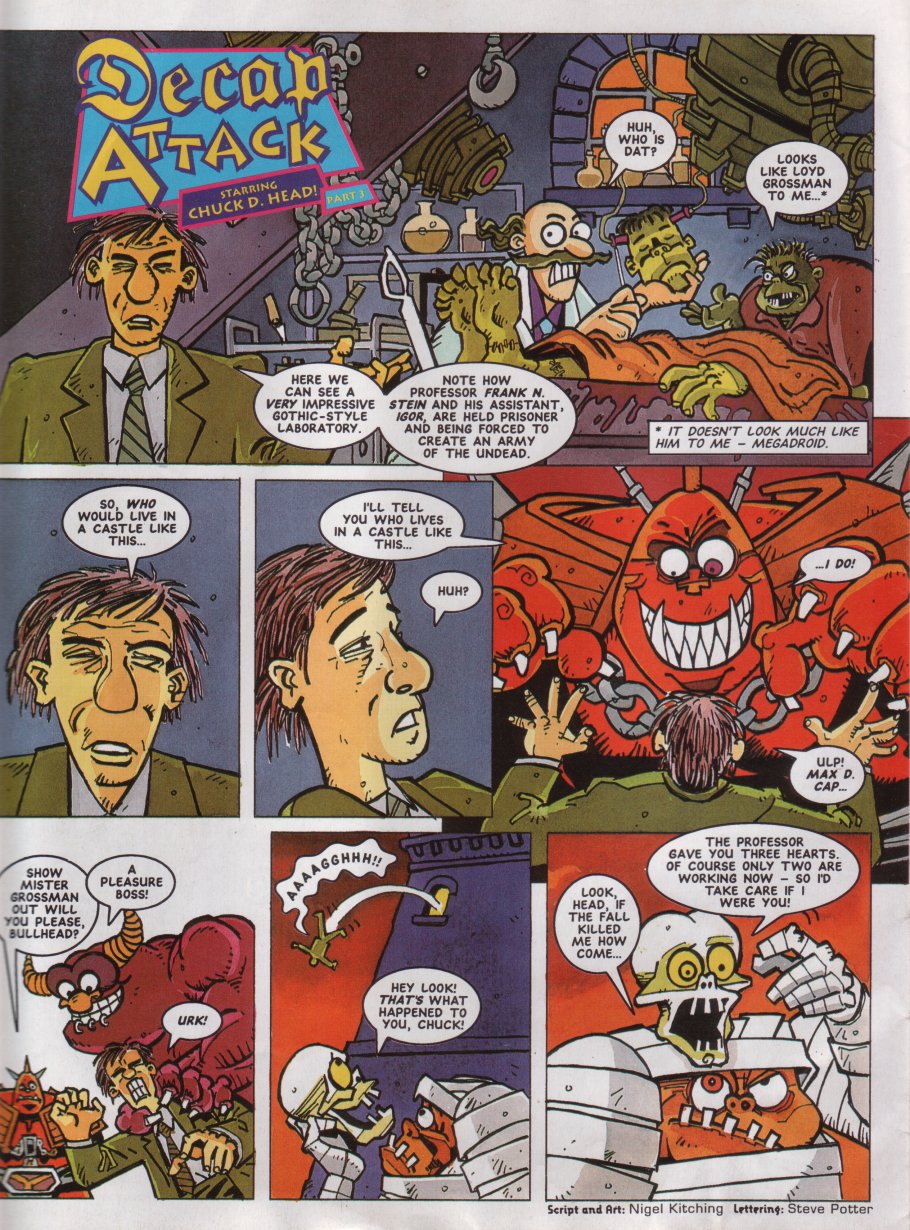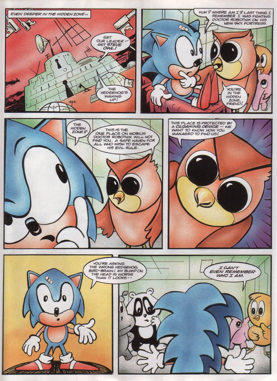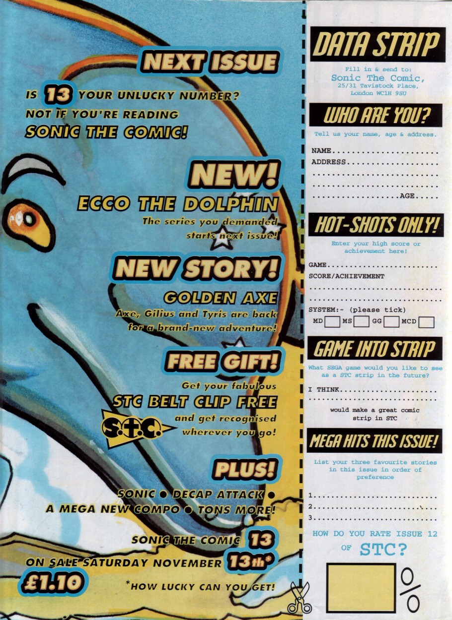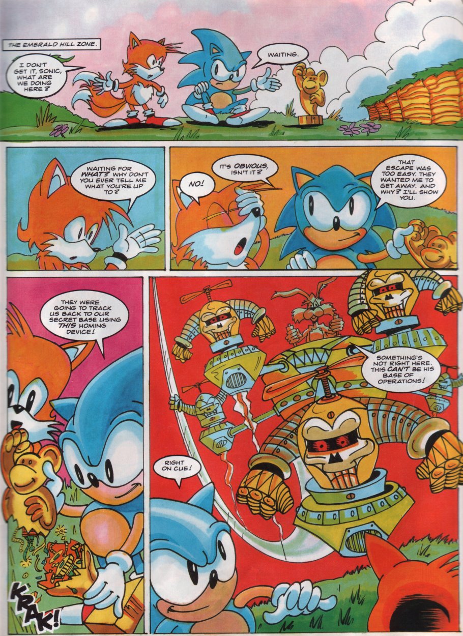 Title: Sonic The Comic #12Type: Regular SeriesDate: 30th October 1993Published By: Fleetway Editions Ltd.Scanned By: Ezekielhttp://stc-archive.gue-network.comEditor: Richard BurtonAsst. Editor: Deborah TateDesigner: Clare GillmoreManaging Editor: Steve MacManusPublisher: Chris PowerContents:Page 1 Cover Artist: ??Page 2 Control ZonePage 3-9 Sonic the Hedgehog - Hidden Danger! Script: Mark Millar Art: Carl Flint Lettering: Ellie de VillePage 10-12 Review Zone Reviewer: Vincent Low Reviewer: David GibbonPage 13-17 Kid Chameleon (Part6) Script: Michael Cook Art: Brian Williamson & Steve White Lettering: Tom FramePage 18-19 News ZonePage 20-24 Streets of Rage (Part6) Script: Mark Millar Art: Peter Richardson Lettering: Tom FramePage 25-26 Q Zone - Q&A Special Game Guru: David GibbonPage 27-30 Decap Attack starring Chuck D. Head! (Part3) Script: Nigel Kitching Art: Nigel Kitching Lettering: Steve PotterPage 31 SpeedlinesPage 32 Next Issue