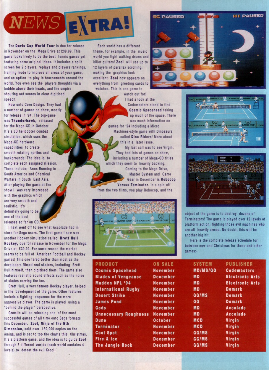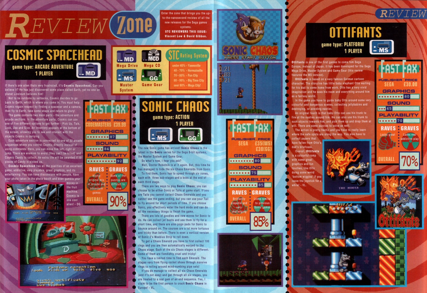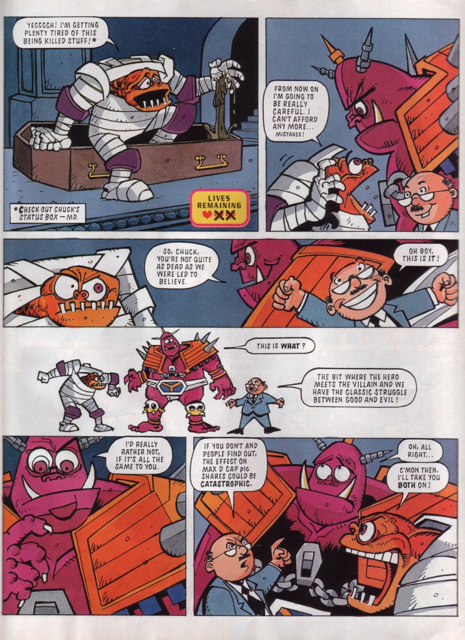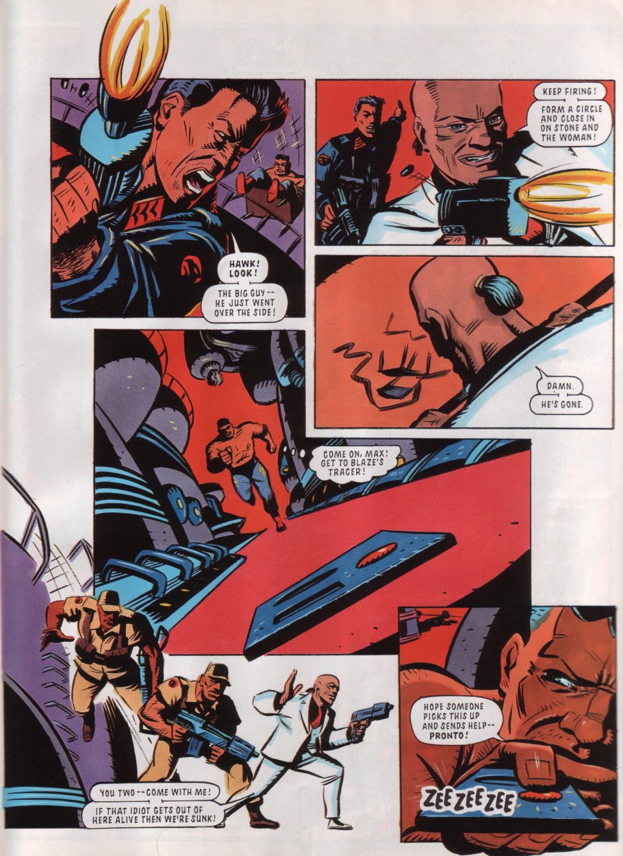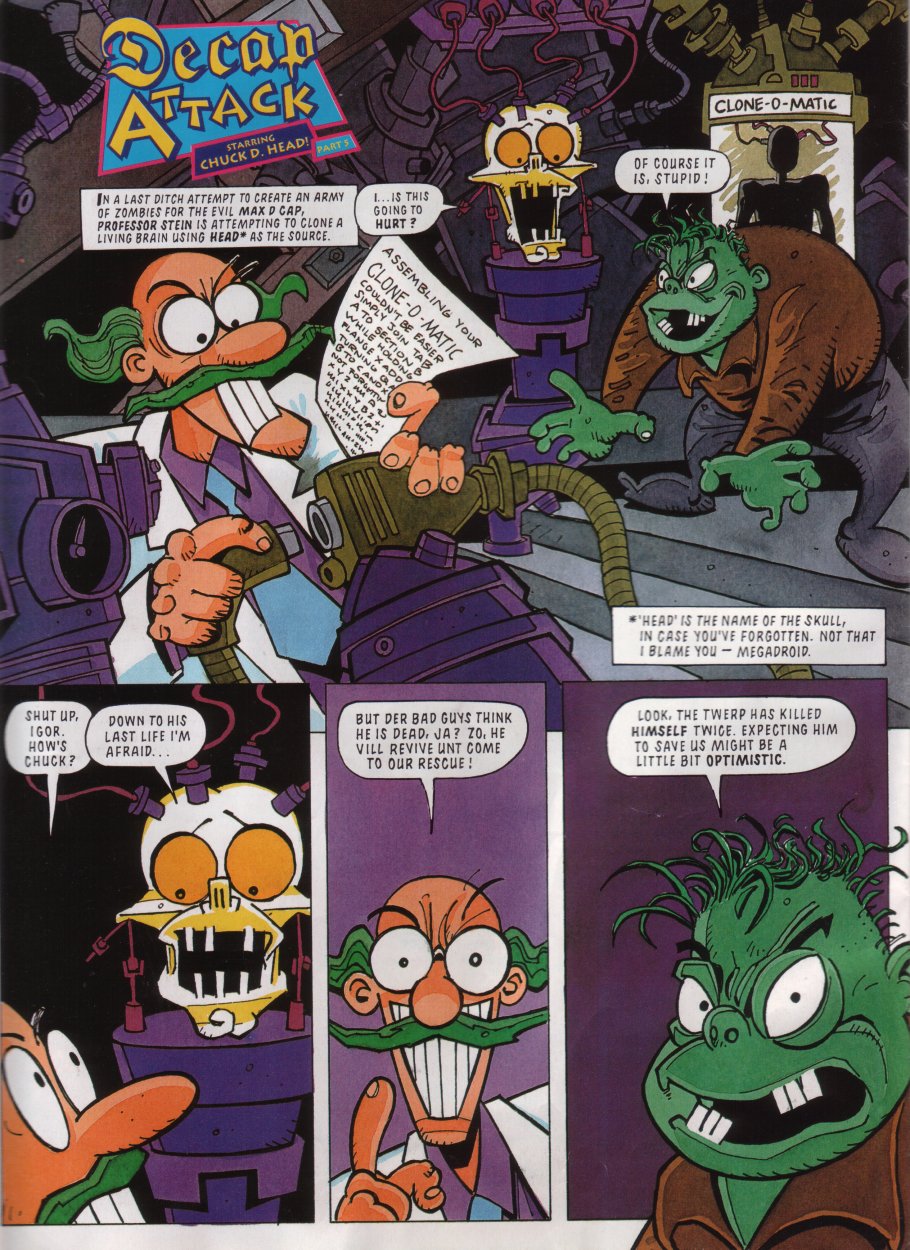 Title: Sonic The Comic #12Type: Regular SeriesDate: 30th October 1993Published By: Fleetway Editions Ltd.Scanned By: Ezekielhttp://stc-archive.gue-network.comEditor: Richard BurtonAsst. Editor: Deborah TateDesigner: Clare GillmoreManaging Editor: Steve MacManusPublisher: Chris PowerContents:Page 1 Cover Artist: ??Page 2 Control ZonePage 3-9 Sonic the Hedgehog - Hidden Danger! Script: Mark Millar Art: Carl Flint Lettering: Ellie de VillePage 10-12 Review Zone Reviewer: Vincent Low Reviewer: David GibbonPage 13-17 Kid Chameleon (Part6) Script: Michael Cook Art: Brian Williamson & Steve White Lettering: Tom FramePage 18-19 News ZonePage 20-24 Streets of Rage (Part6) Script: Mark Millar Art: Peter Richardson Lettering: Tom FramePage 25-26 Q Zone - Q&A Special Game Guru: David GibbonPage 27-30 Decap Attack starring Chuck D. Head! (Part3) Script: Nigel Kitching Art: Nigel Kitching Lettering: Steve PotterPage 31 SpeedlinesPage 32 Next Issue
