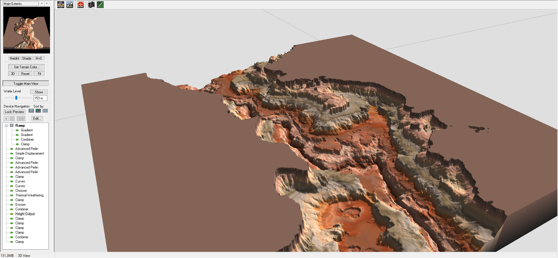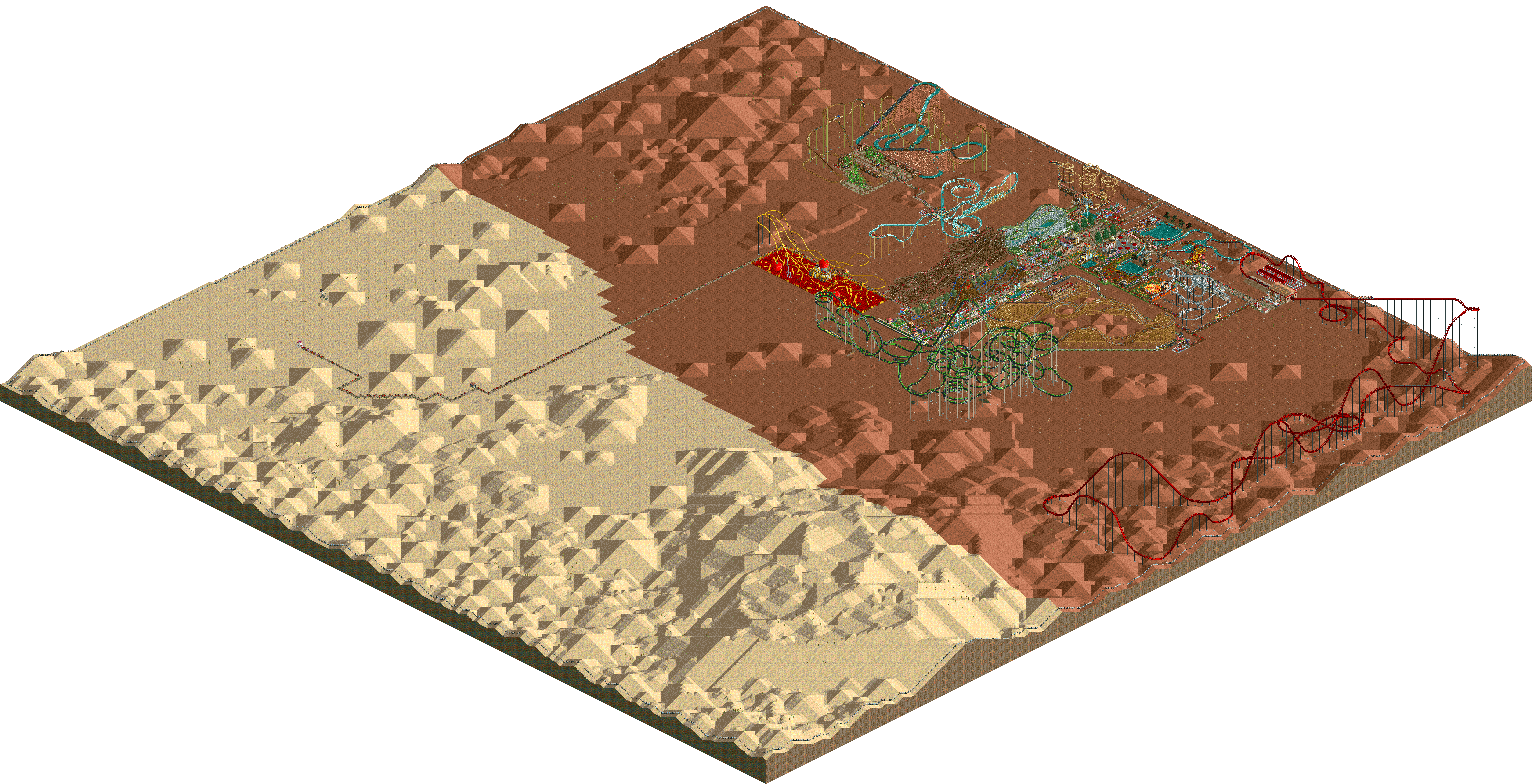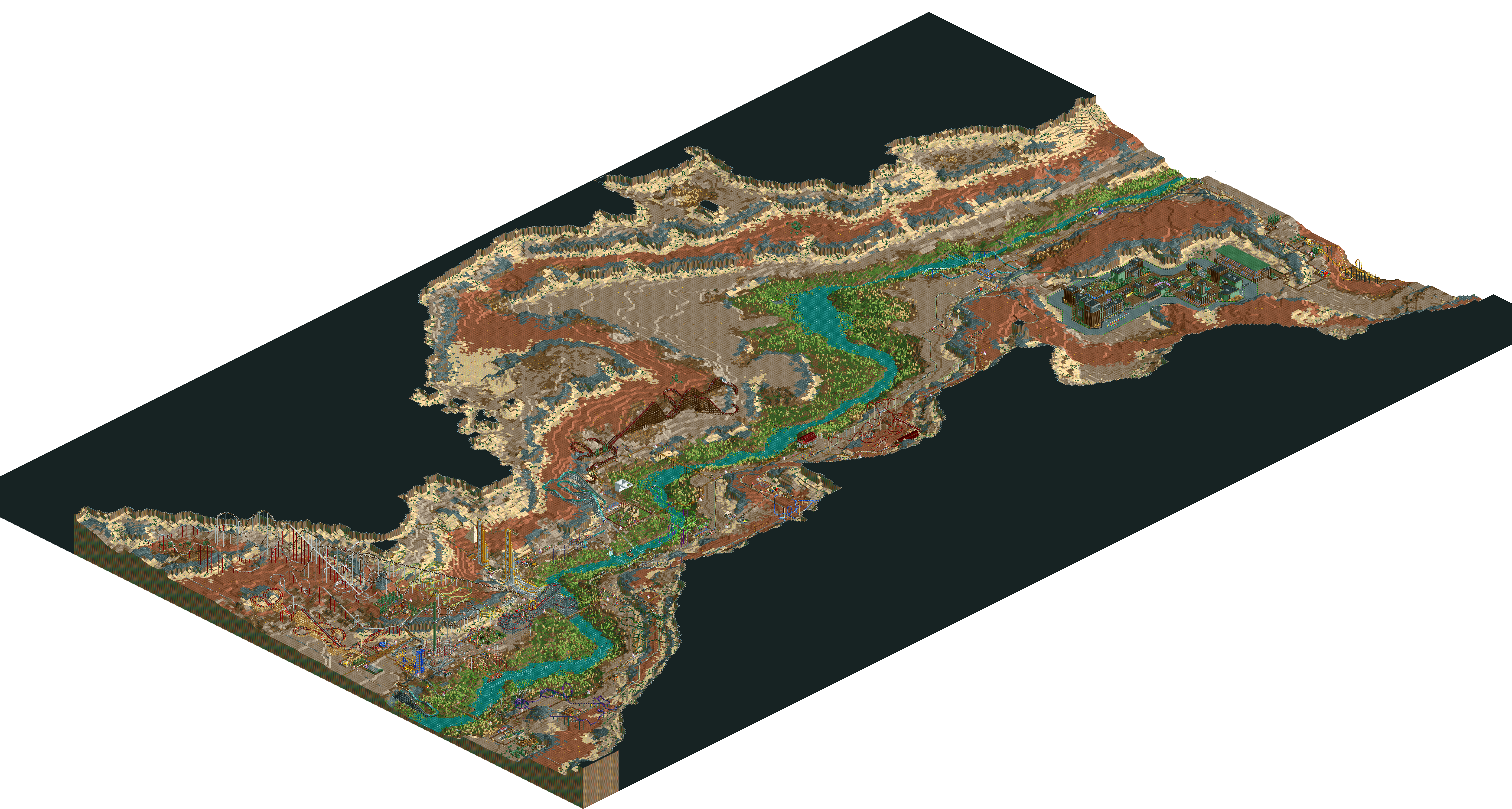Most of the maps i've made, i used World Machine which is an old terrain generation program. I think OpenRCT has improved generating a map from a heightmap a lot but it's still a huge trainwreck when you import it and you need to do a bunch of fixing up. Here is what it looks like in World Machine.