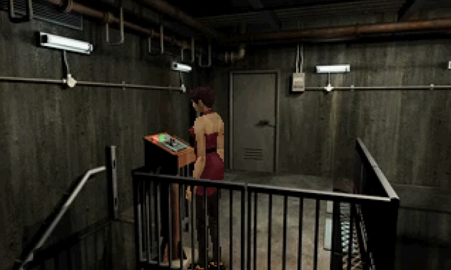 this part of re2. my brother and i both could not tell you could drop down next to that handrail (which looked more like a pipe to me). it didnt help that i was playing on a tiny tv but i remember being stuck here for a few days i think. i would come home from school and play for a few minutes trying to figure out what was wrong. i really thought my save was bricked or something until i finally realized.