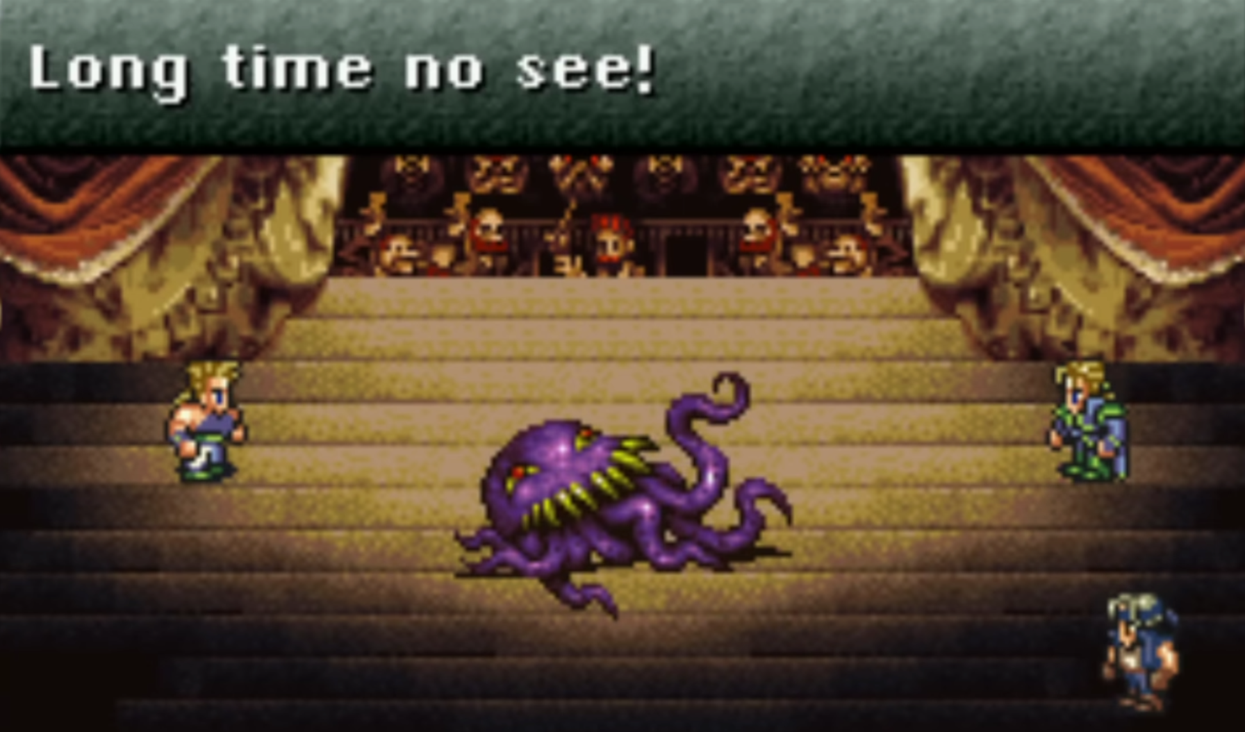 I was stuck on the opera sequence forever, either running out of time or dying to Ultros. Then, when I *finally* beat it, during the cutscene flying to Vector, my dad ripped out the plug on the SNES. That moment was burned into my psyche.